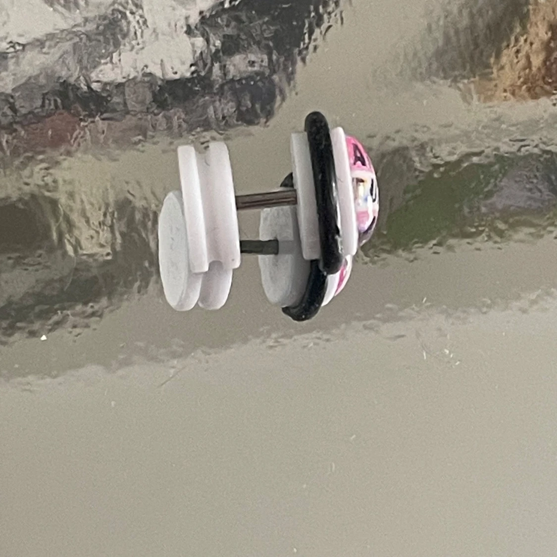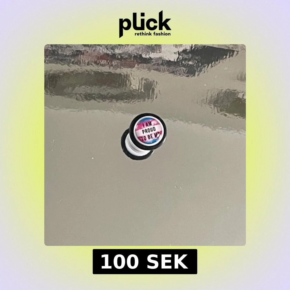 Säljer ett coolt örhönge med transflagga och texten 'I am proud to be me'. Örhänhet har svart kant och vita detaljer. Perfekt för att uttrycka din stil och identitet.