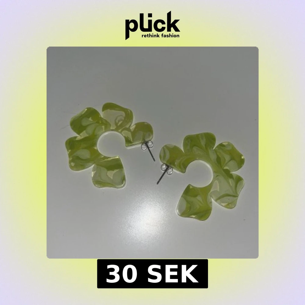 Snygga örhängen i form av stora blommor med swirlmönster i olika gröna nyanser. Tillverkade i akrylplast och har metallstift. Endast använda 1 gång
