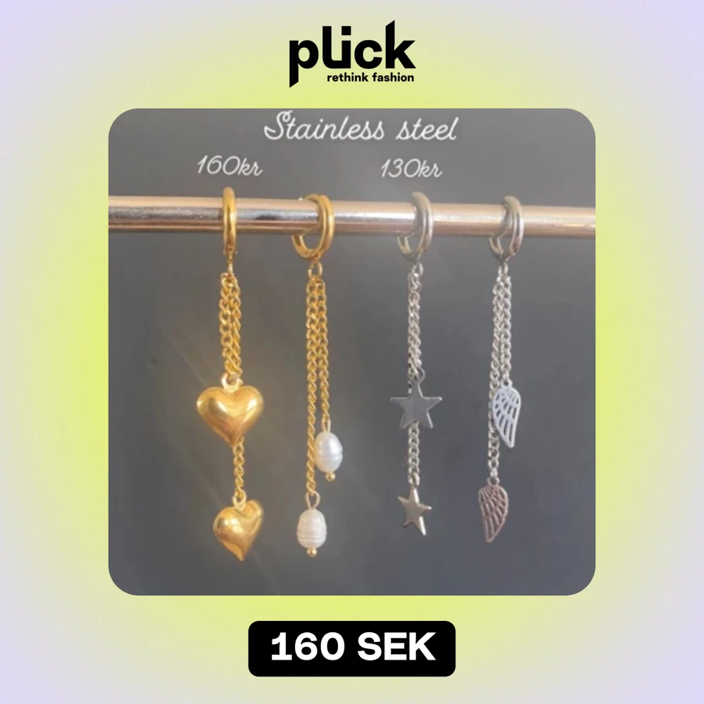 örhängen och halsband  - Stilrena örhängen och halsband inspirerade av Maria Nilsdotter. Material-rostfritt stål. Örhängen längd-3,7cm, halsband längd-40cm. ☝️Vid köp ingår två extra berlocker som kan bytas ut, då själva hänget är ömtåligt och känsligt för stötar.