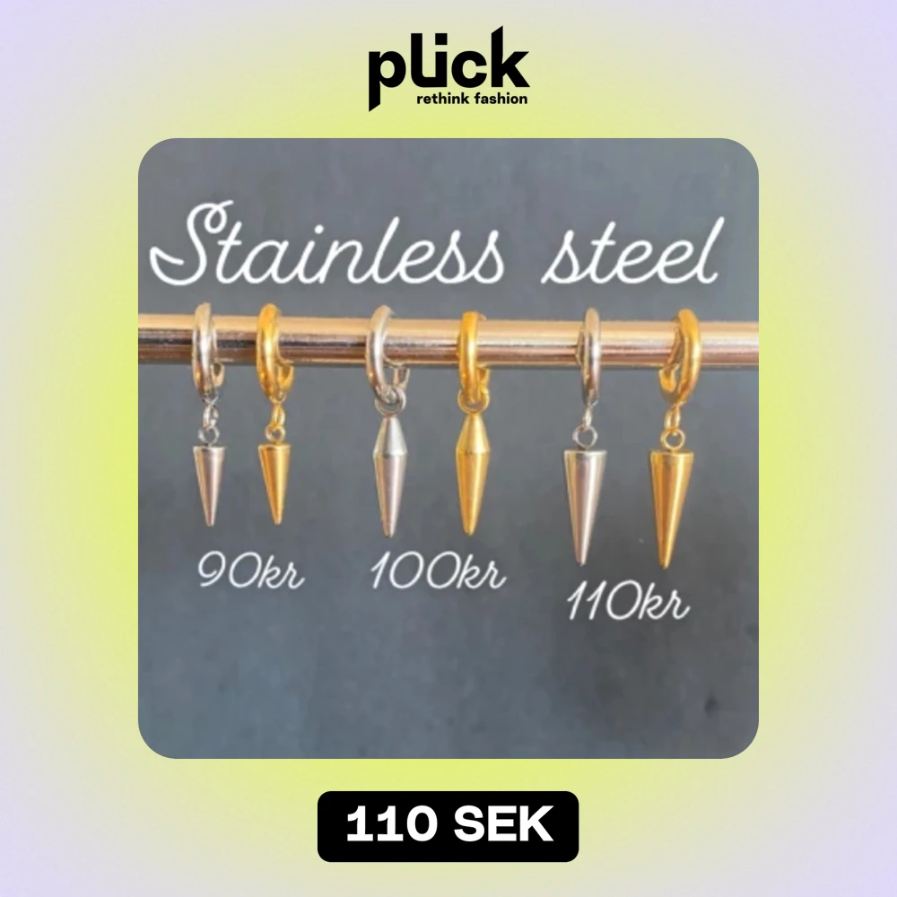 Örhängen med halsband  - Stilrena örhängen och halsband inspirerade av Maria Nilsdotter. Material-rostfritt stål. Örhängen längd-3,7cm, halsband längd-40cm. ☝️Vid köp ingår två extra berlocker som kan bytas ut, då själva hänget är ömtåligt och känsligt för stötar.