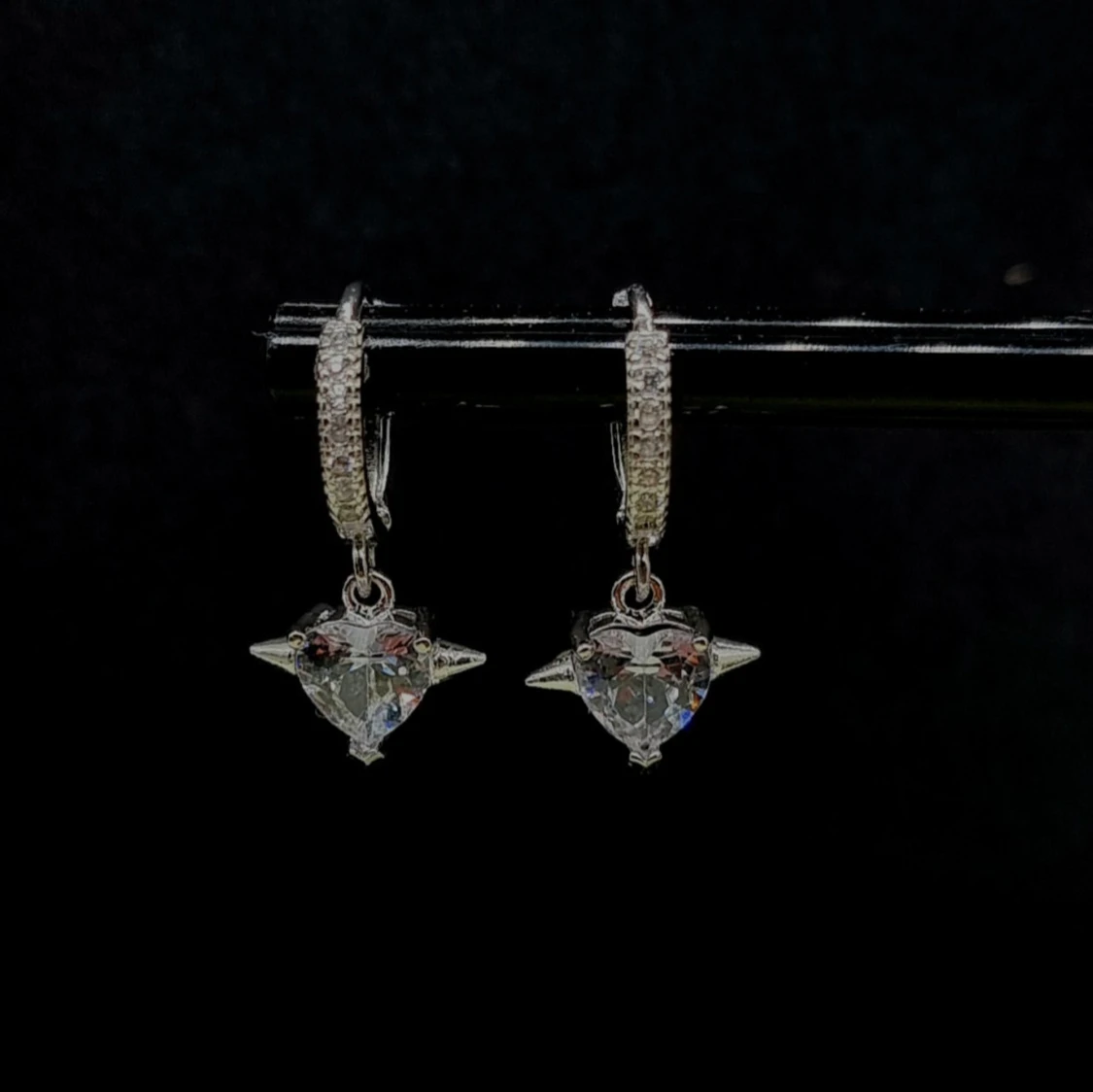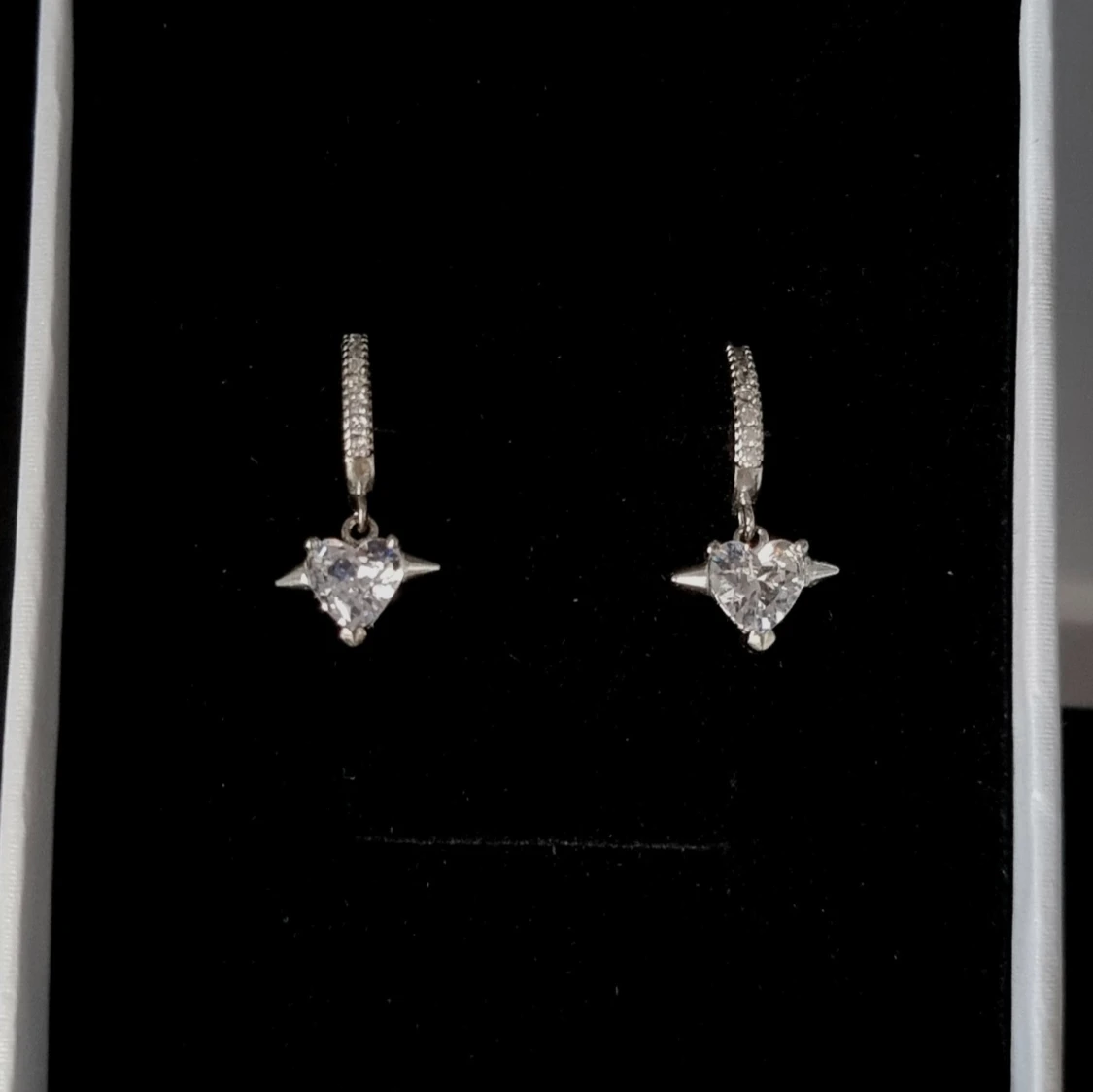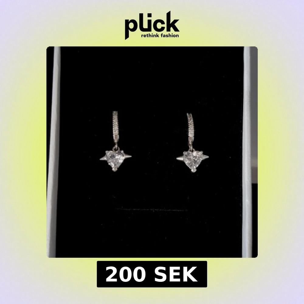Ett par snygga örhängen i silverfärg med gnistrande hjärtformad sten och små stenar på själva ringen. Hängande modell som ger en cool och elegant vibe. Perfekta för att lyfta din look med lite extra bling.