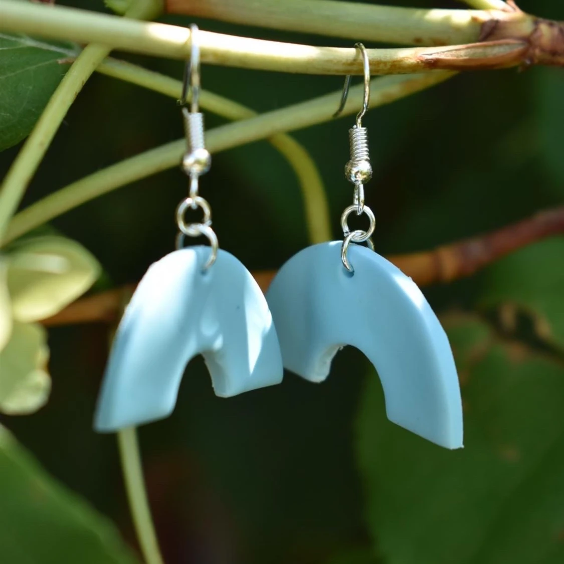 Ljusblåa örhängen. Handgjorda örhängen utav polymer lera med silver hängen, ca 3-4 cm i diamanter. 49kr + 20kr frakt