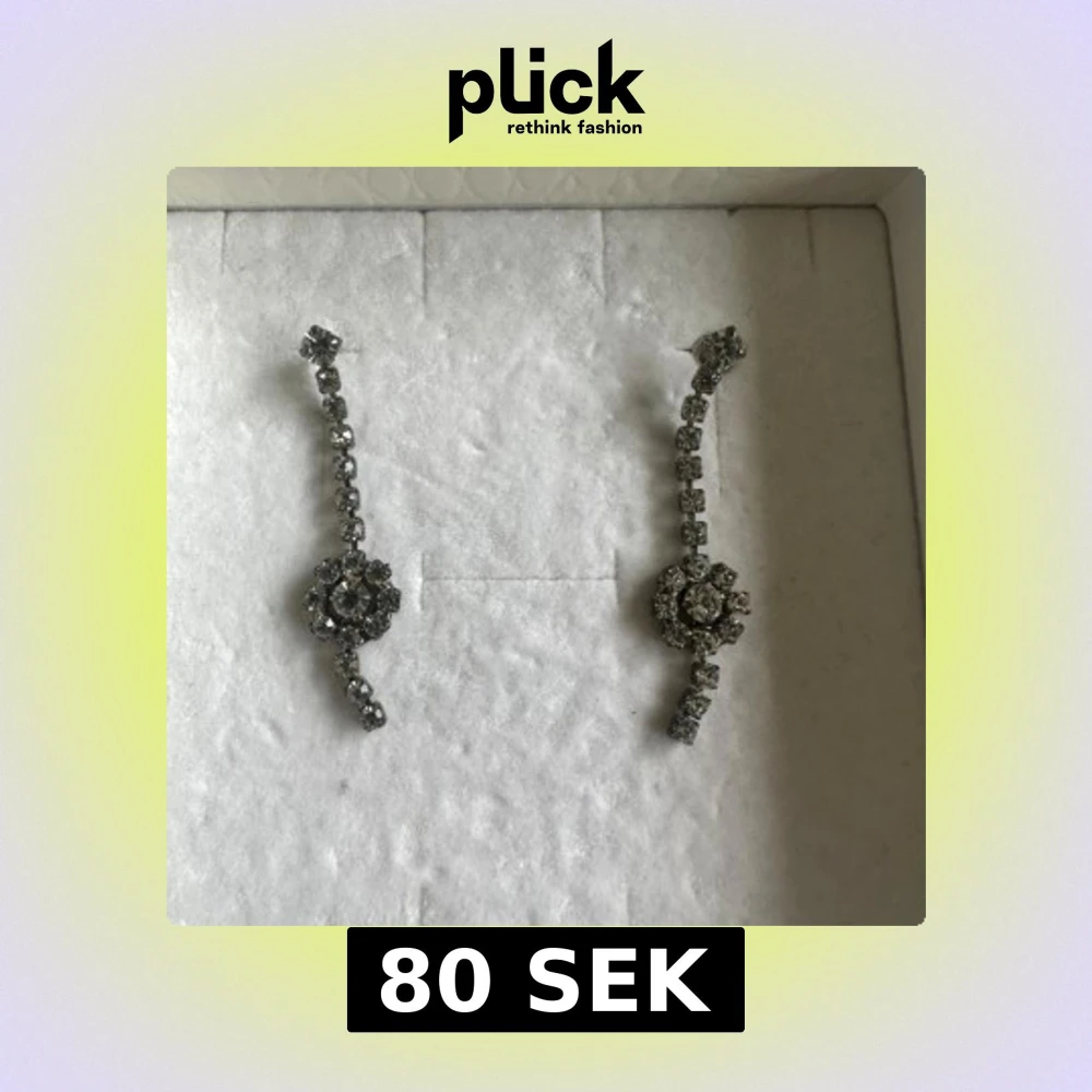 Säljer ett par snygga örhängen i silverfärg med glittrande stenar. De har en böjd form och en rund blomliknande detalj i mitten, täckt av små gnistrande stenar