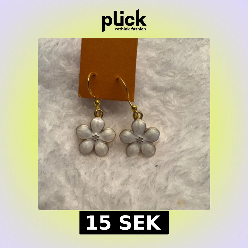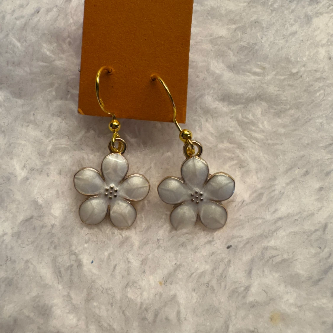 Säljer ett par söta örhängen med blommor i vit emalj och guldfärgade detaljer. Blommorna har fem kronblad och små pärlliknande detaljer i mitten. Perfekta för att ge en romantisk touch till din stil. Krokarna är i sterling silver
