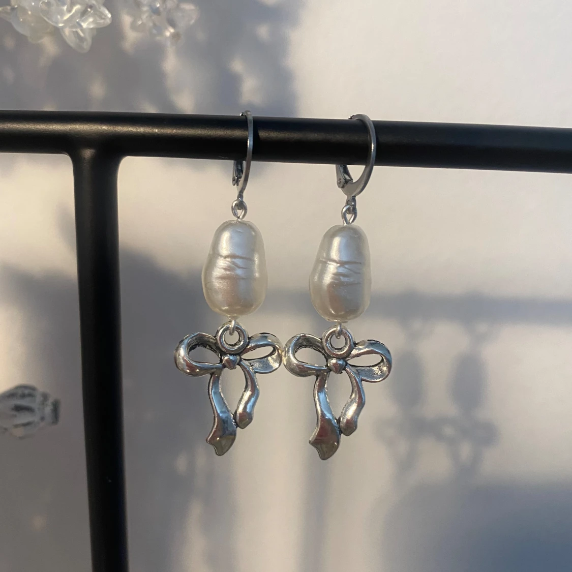 Söta rosettörhängen med vita pärlor.🎀 finns endast 2 par! Delvis rostfria!