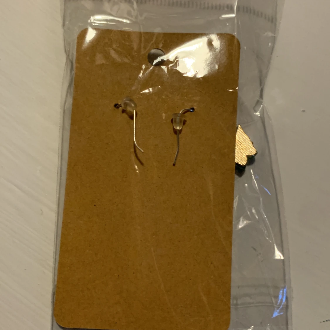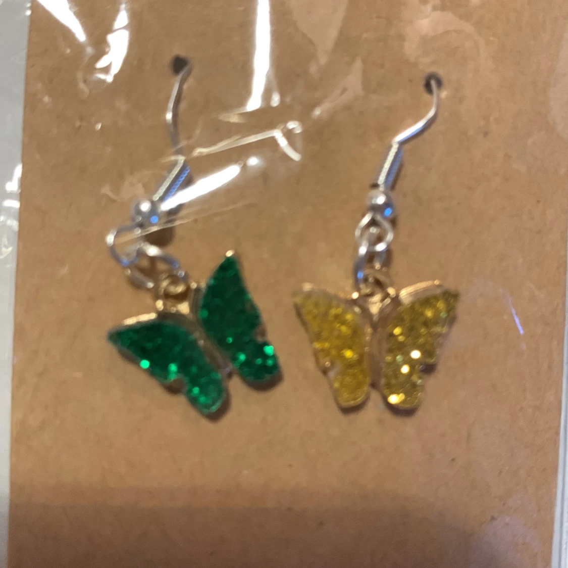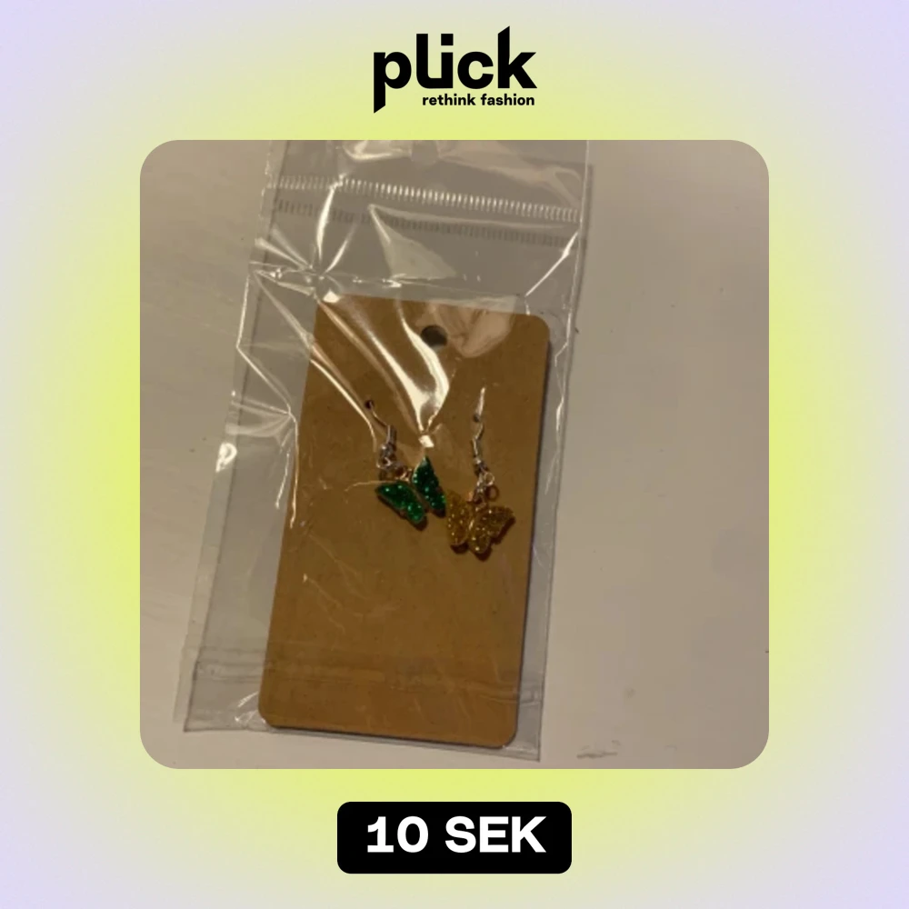 Ett par fjärilsörhängen med en gul fjäril och en grön. Är aldrig använda, och ligger som ni ser kvar i förpackningen.