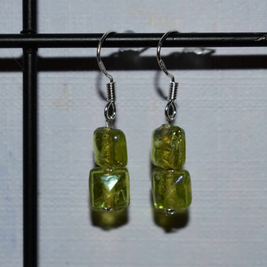 Handgjorda örhängen med gröna glaspärlor. De görs vid beställning och är därmed helt oanvända. Krokarna är gjord av äkta silver. OBS endast ett par kvar!! Kolla gärna in min profil för fler handgjorda örhängen :))