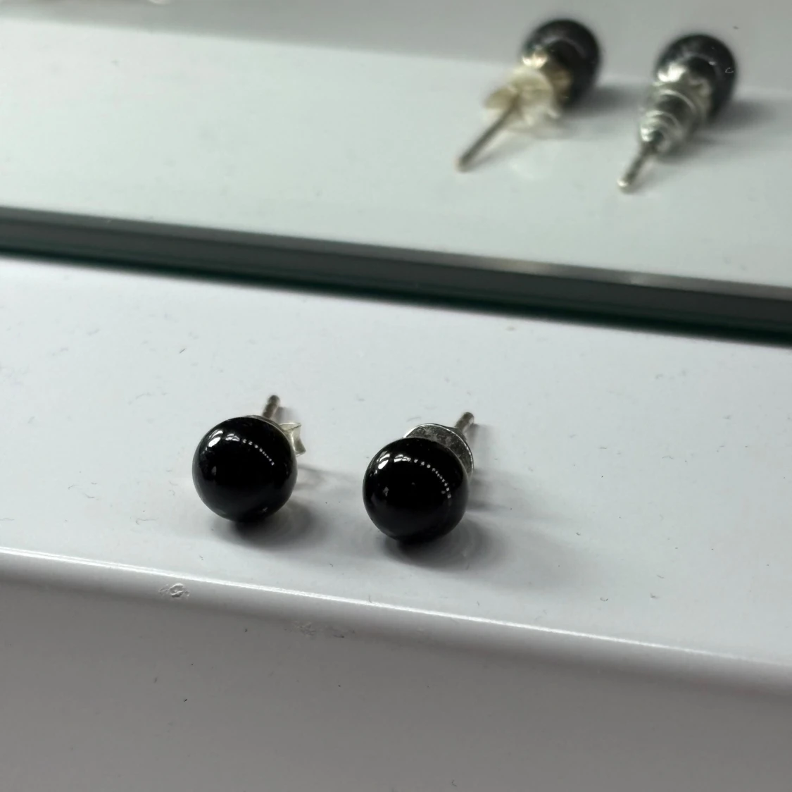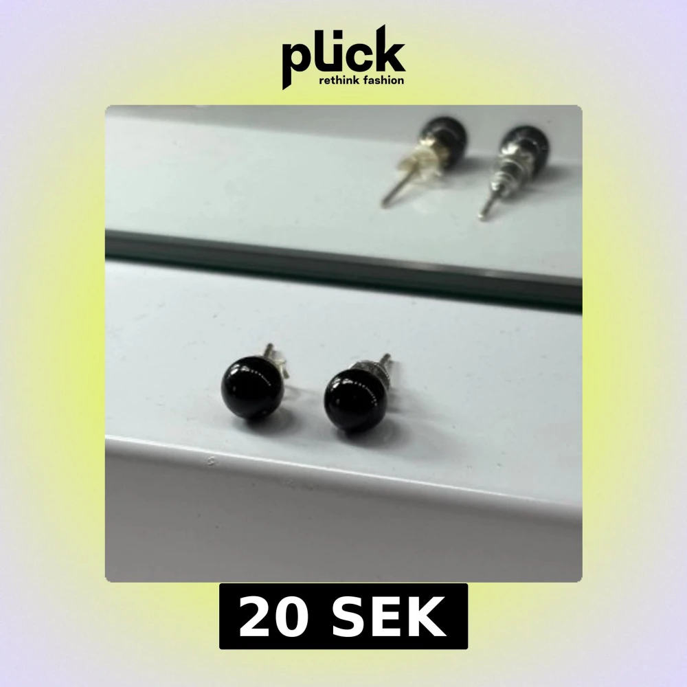 Snygga örhängen med rund svart pärla och silverfärgad stift. Två olika pluppar för ena borttappad.