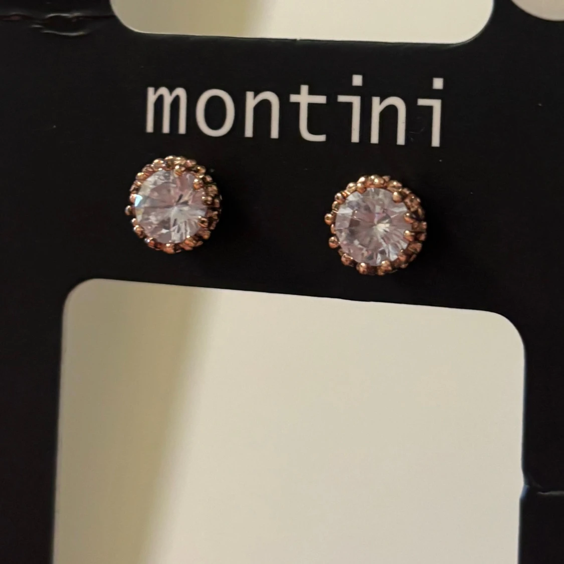 Säljer ett par runda örhängen med gnistrande stenar i mitten och små guldfärgade detaljer runt om.
