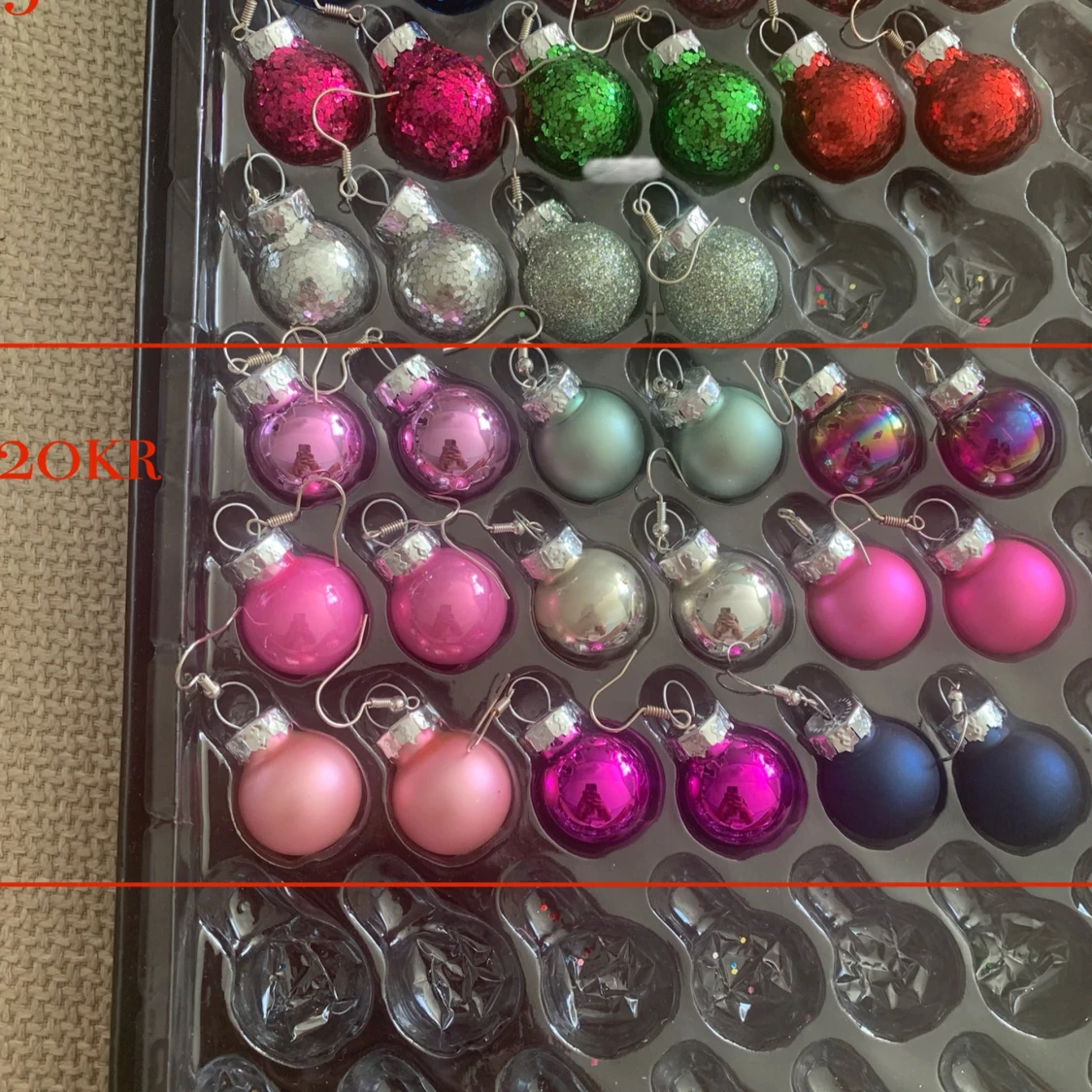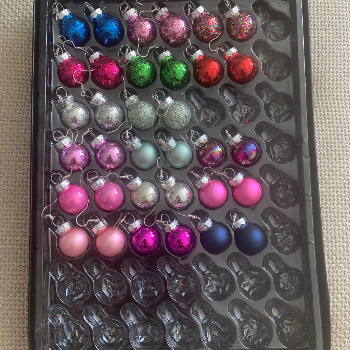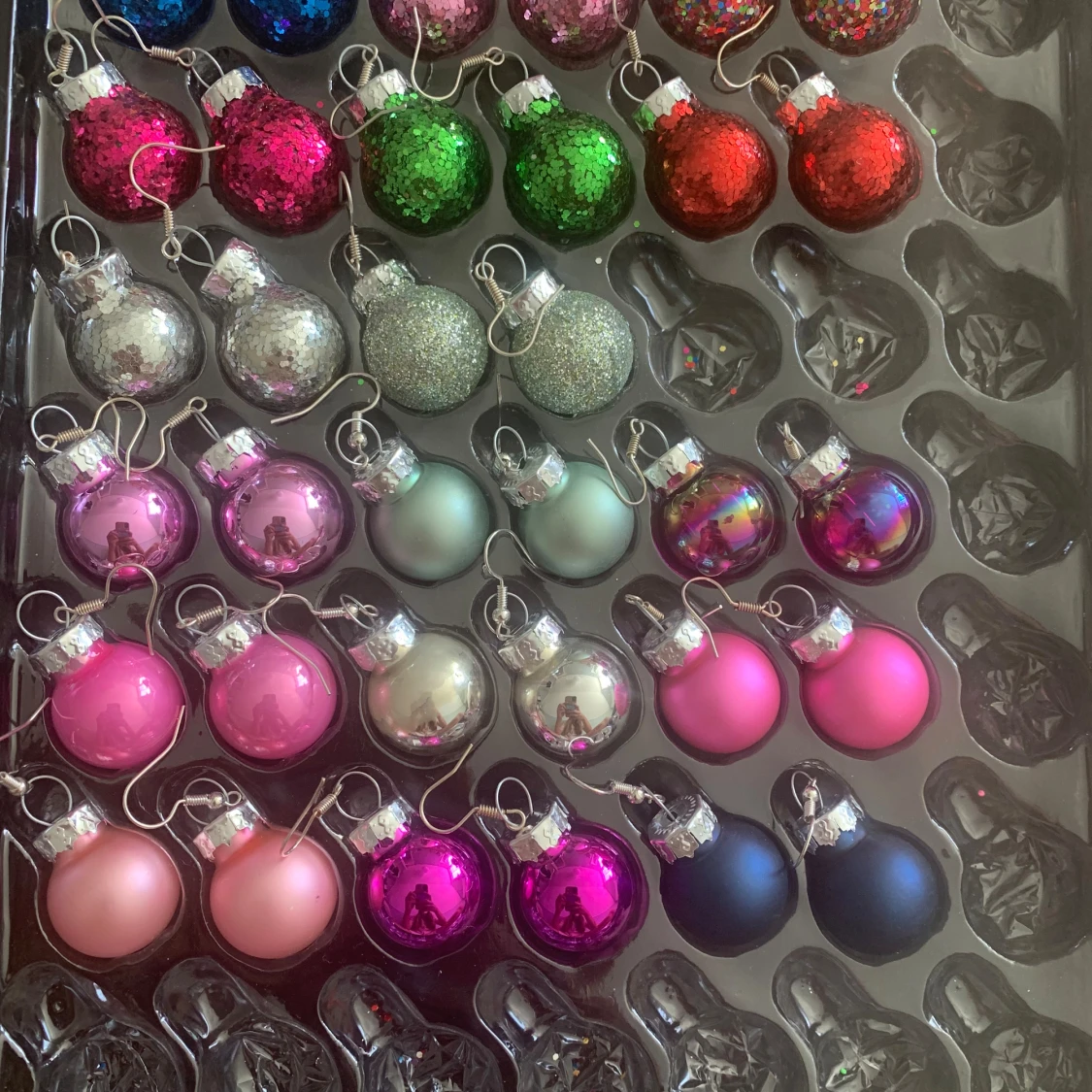 Säljer egentillverkade örhängen med julkulor🎄De glittriga kostar 30kr och de blanka och matta kostar 20kr❤️ Köparen står för frakt, skriv vid frågor.😊
