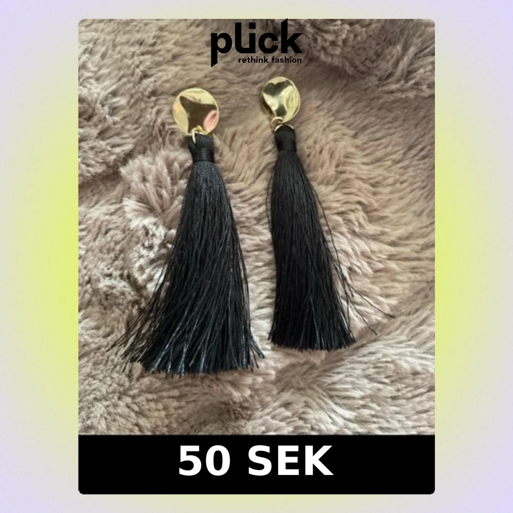 Bilden visar ett par svarta tofsörhängen med guldfärgade detaljer, ingen väst finns med.