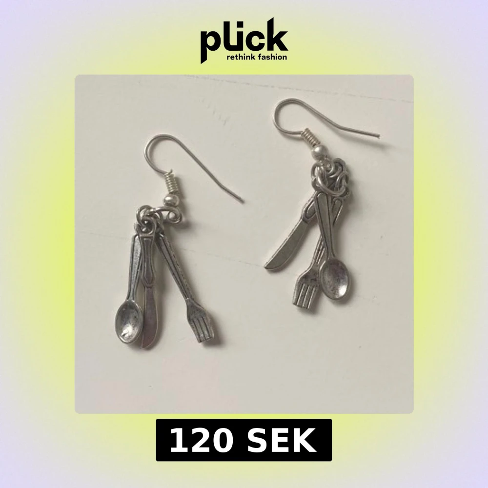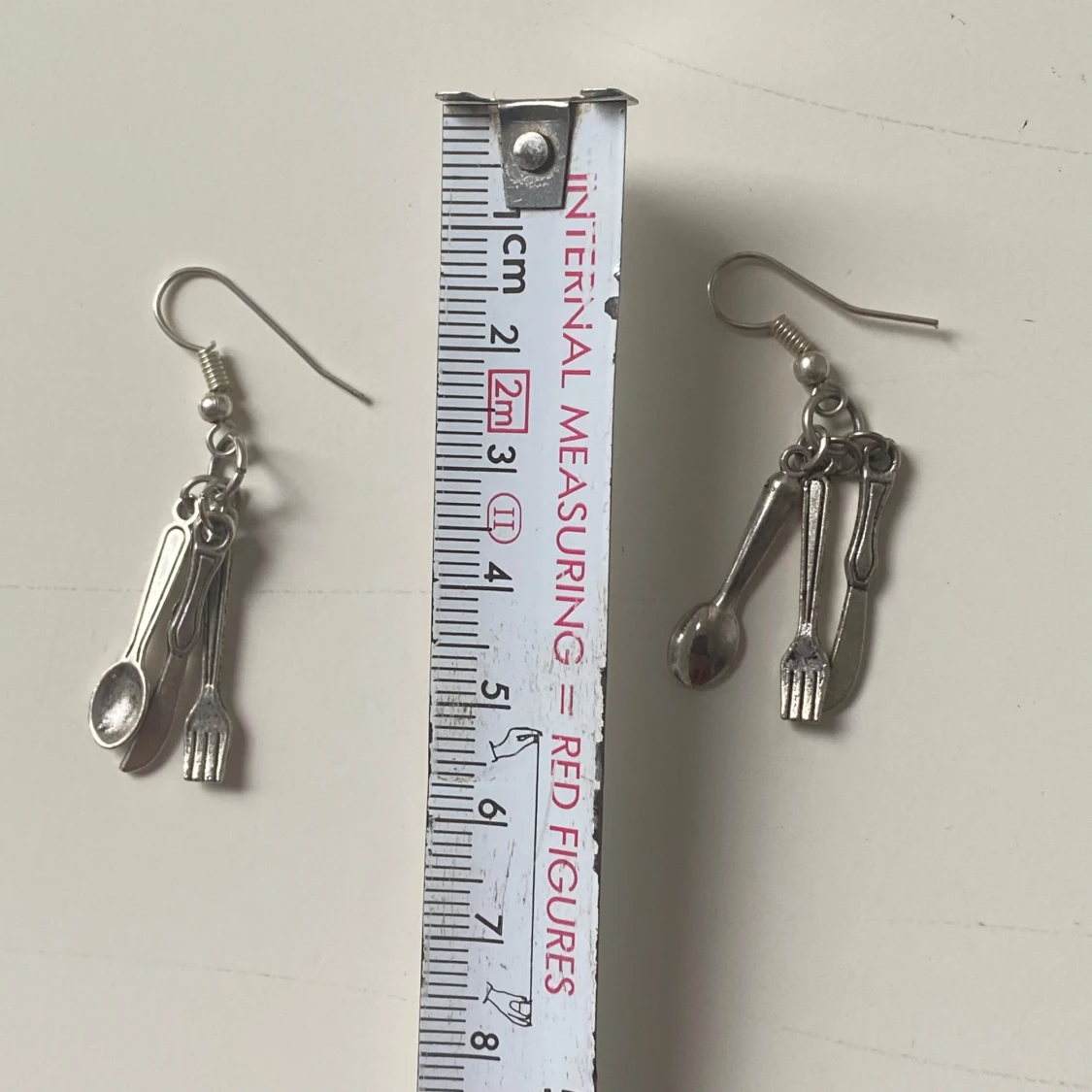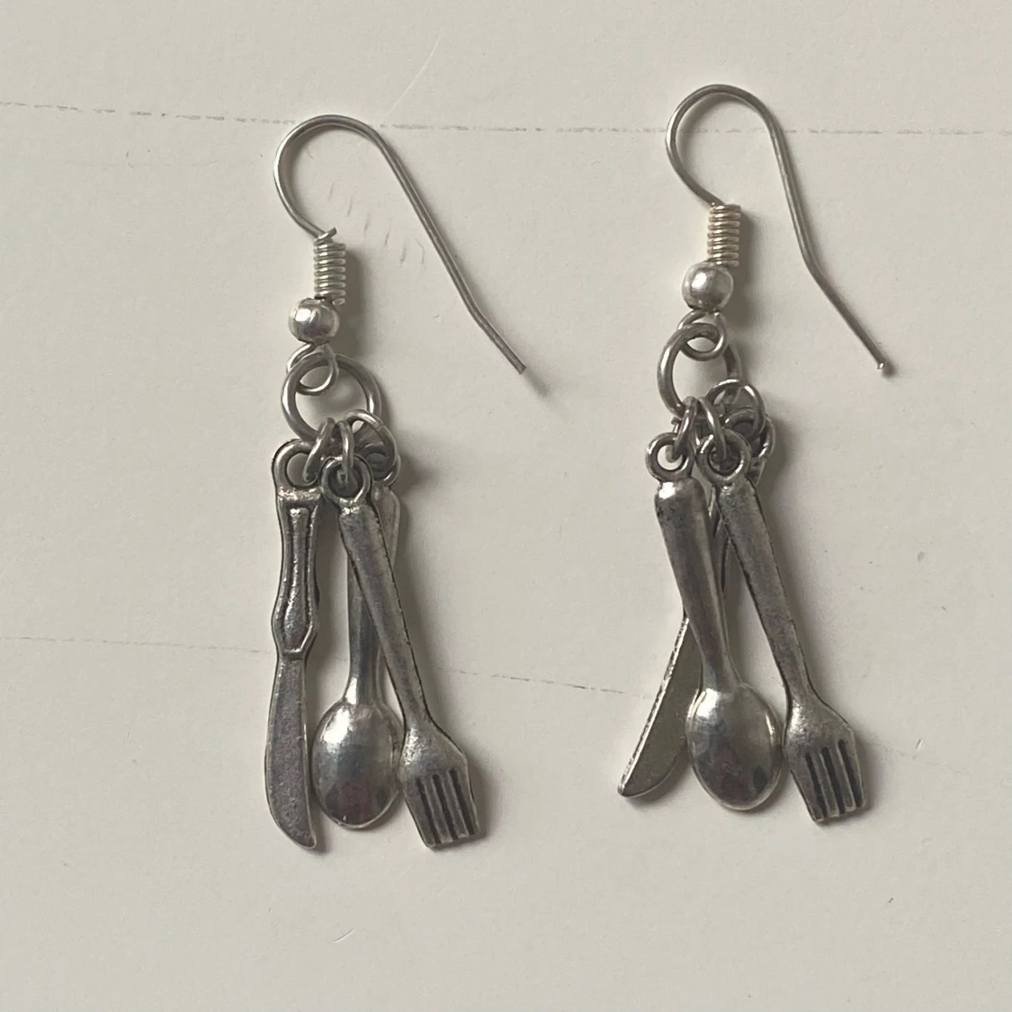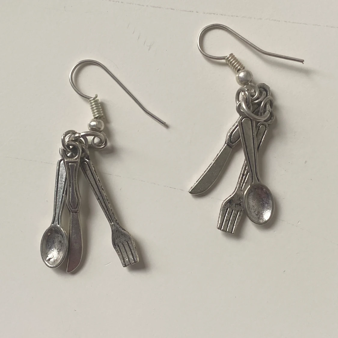 Unika örhängen med små hängande bestick – kniv, gaffel och sked – i silverfärgad metall. Perfekt för dig som gillar quirky accessoarer och vill sticka ut. Lätta att bära och ca 5 cm långa. Säljs som par.