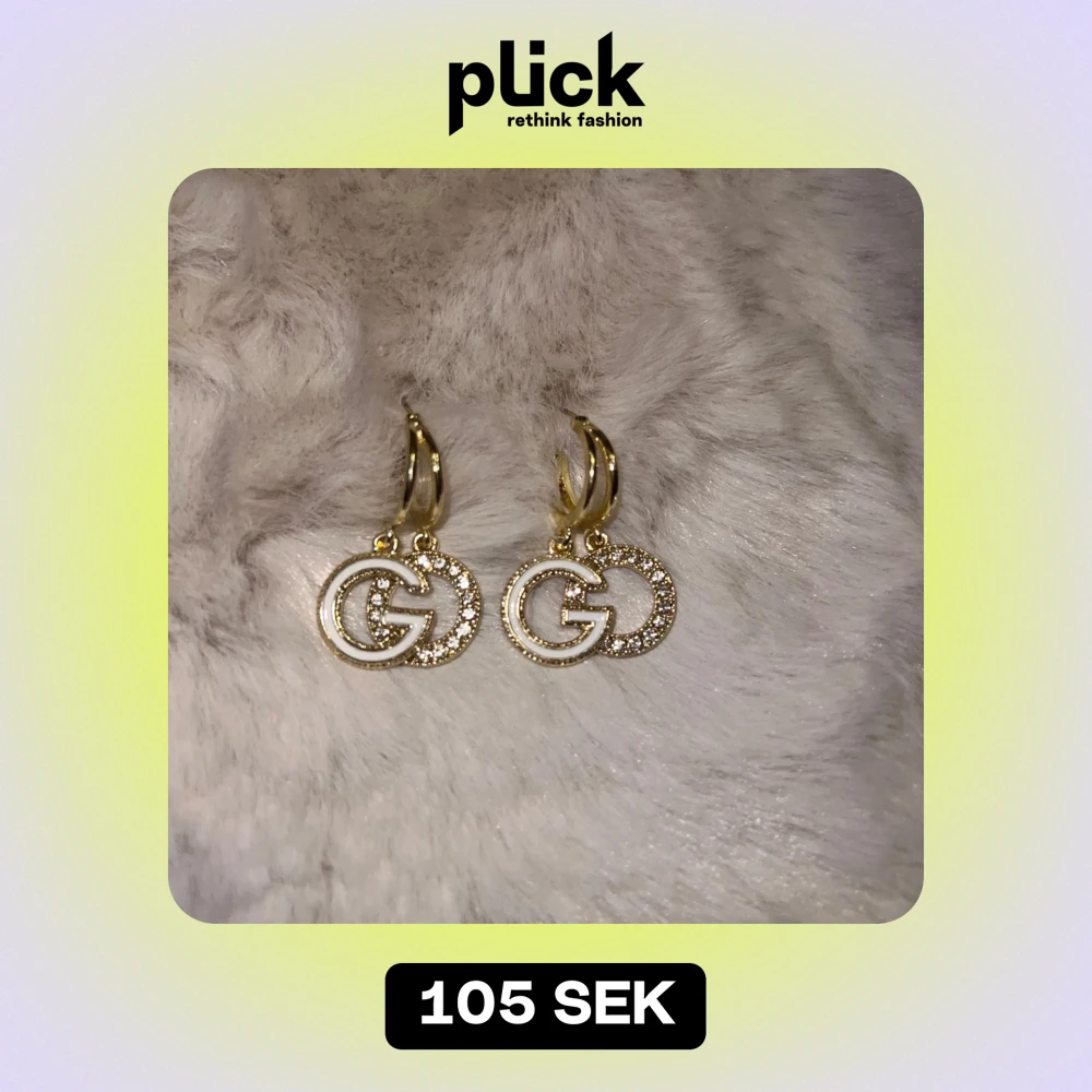 Snygga örhängen med ett stort G-märke och glittrande stenar. Perfekta för att ge lite extra bling till din outfit. De är i mycket bra skick och passar både till vardag och fest. Ett måste för alla som älskar stil och glamour!