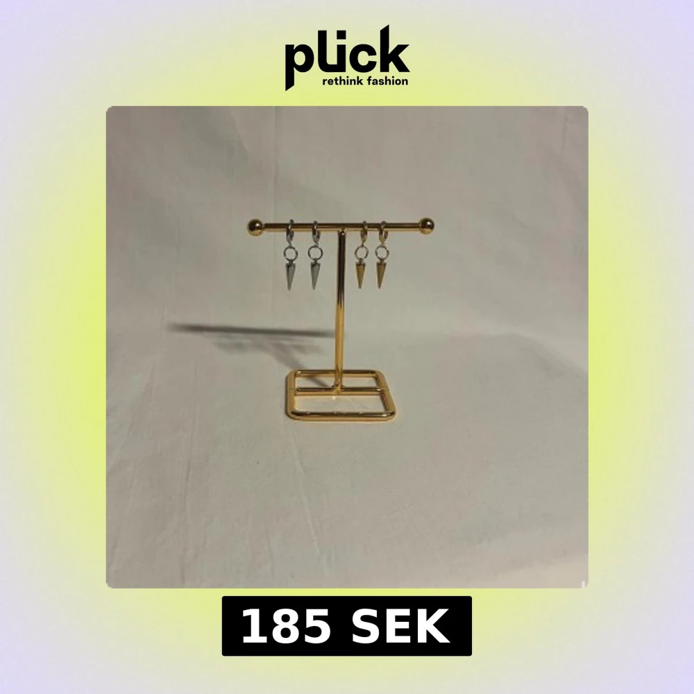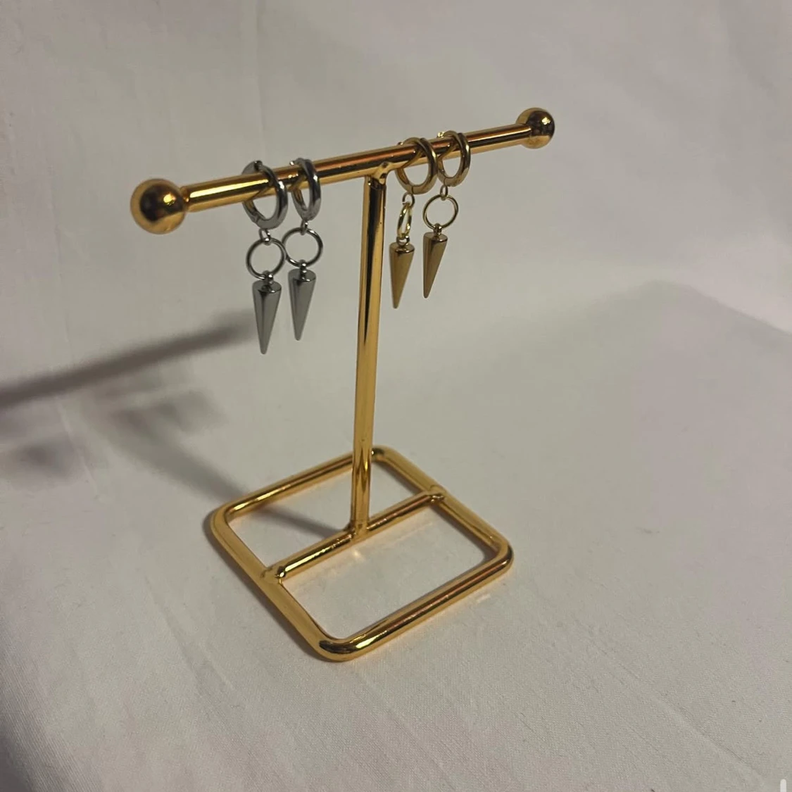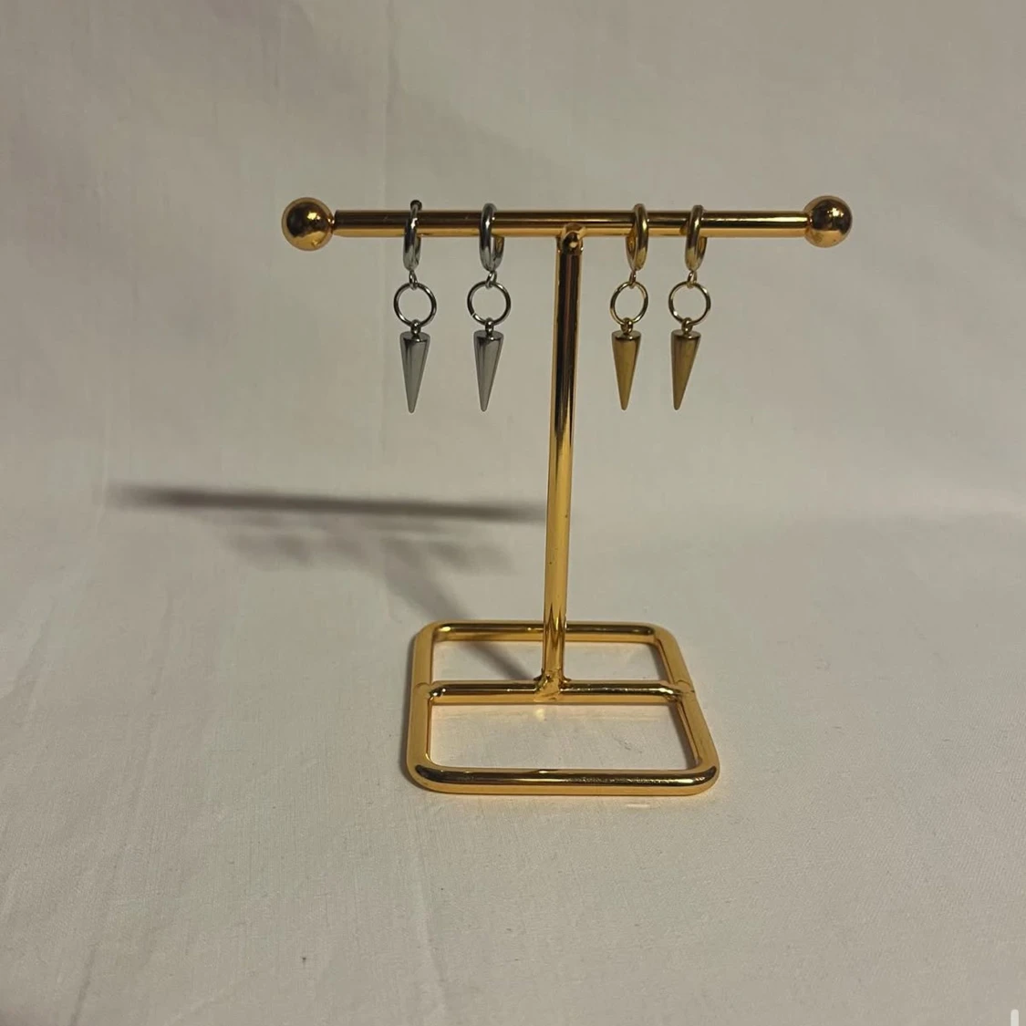 Två par örhängen med konformade hängen, ett par i silverfärg och ett par i guldfärg. Snygg minimalistisk design med små ringar och spetsiga detaljer, perfekta för att ge din look en edgy touch.