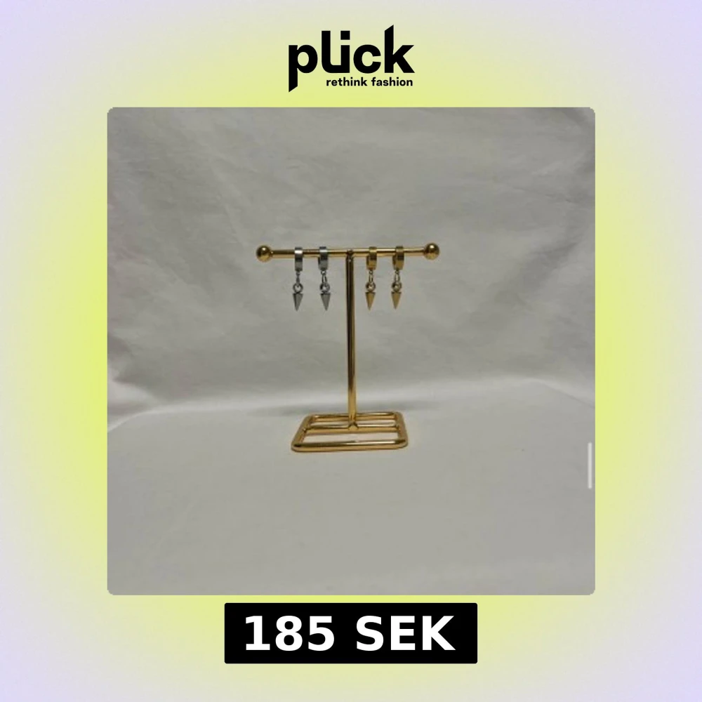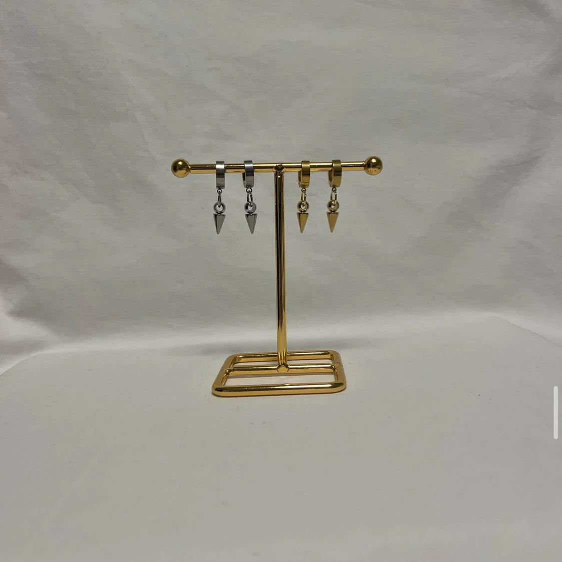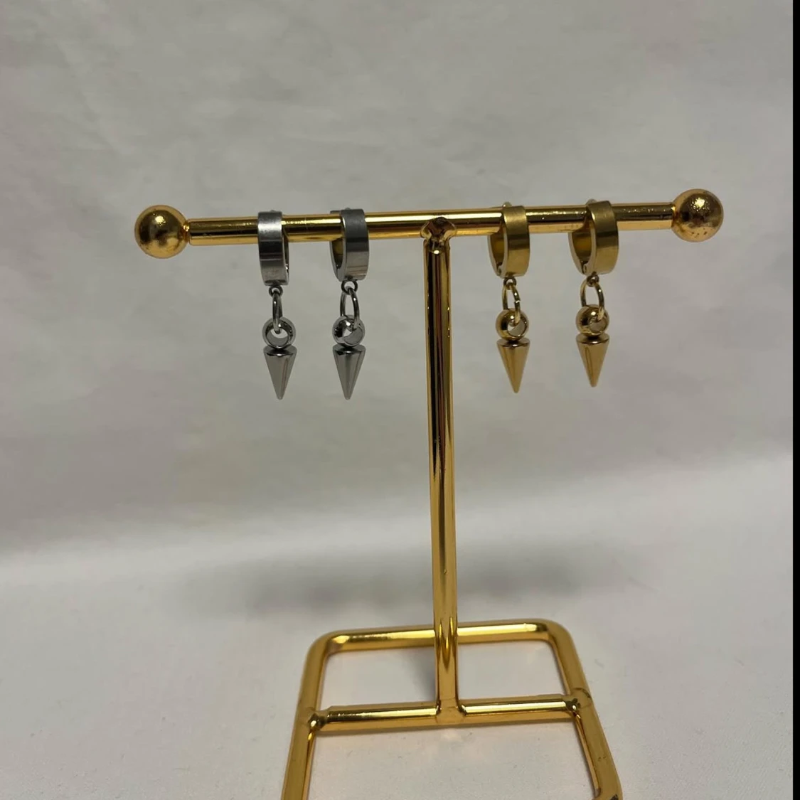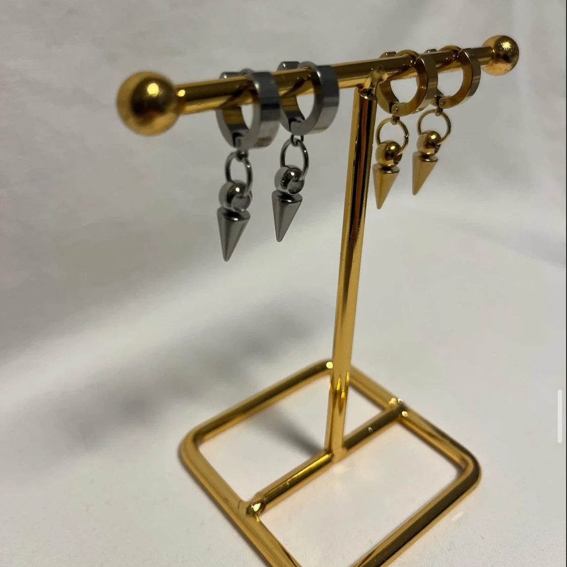 Två par örhängen med coola konformade hängen, ett par i silverfärg och ett par i guld. Båda har chunky ringar och minimalistisk design som ger edgy vibe. Perfekta för att lyfta din stil med en modern touch.
