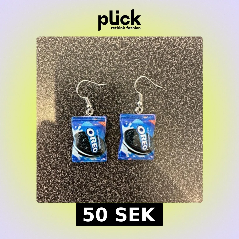 Unika örhängen med en rolig Oreo-design. Perfekta för den som älskar att sticka ut med något annorlunda. De har en blå och svart färgskala med en realistisk bild av ett Oreo-paket. Ett måste för Oreo-fans!