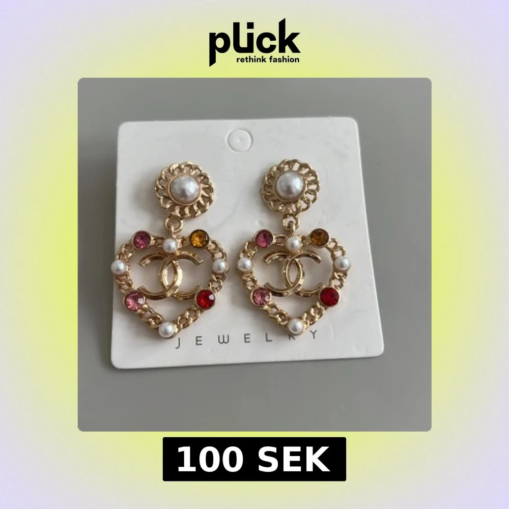 Snygga örhängen med hjärtformad design, dekorerade med vita pärlor och färgglada stenar i rött, rosa och gult. Örhängena har den klassiska CC-loggan i mitten och en pärla upptill. Perfekt för dig som vill sticka ut!