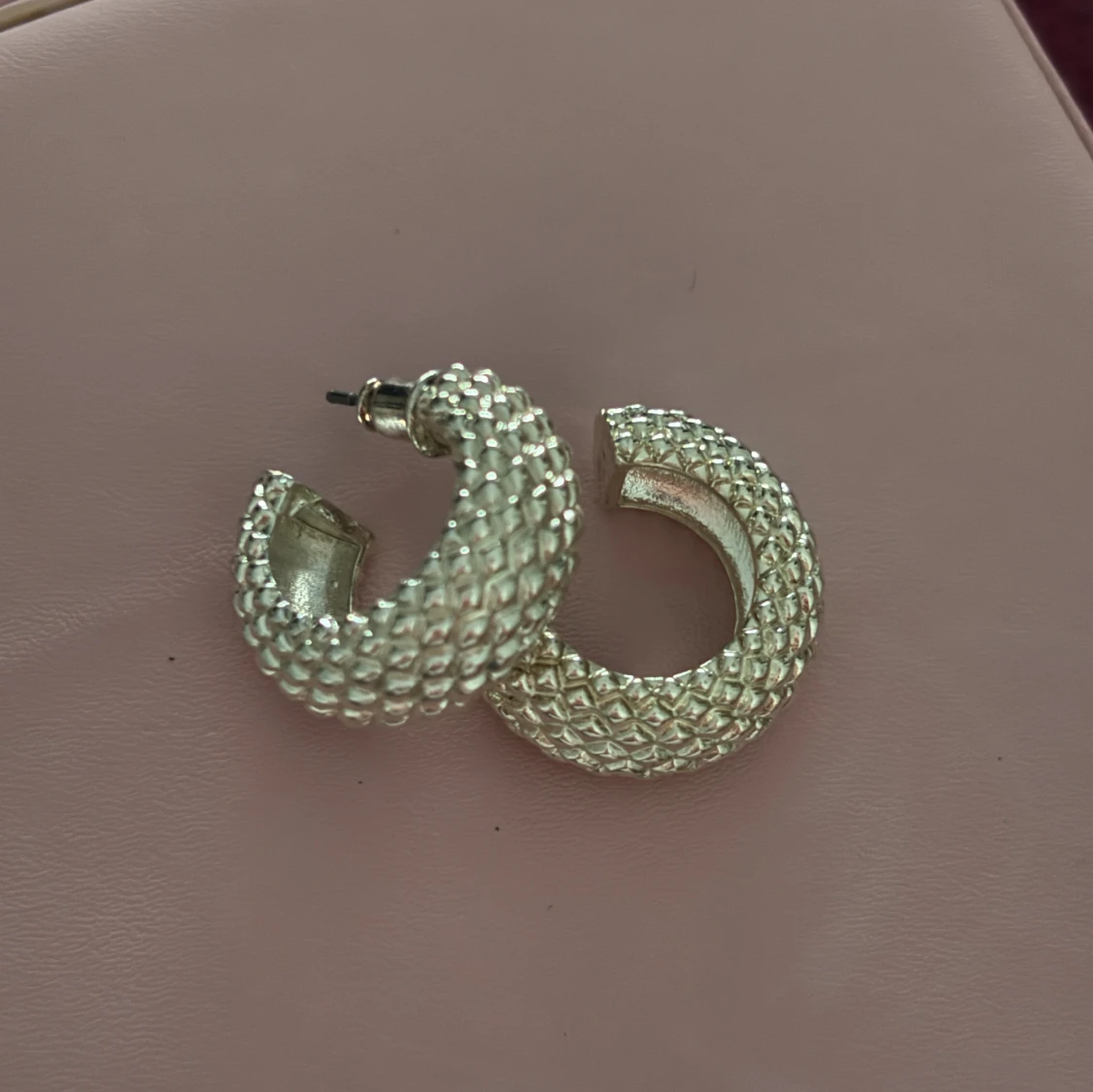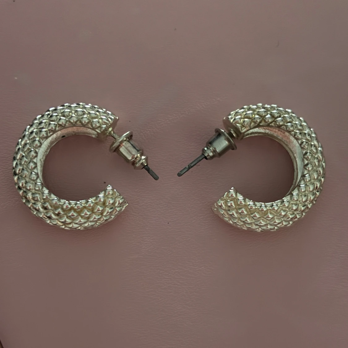 Säljer ett par chunky örhängen i silverfärg med coolt reliefmönster.