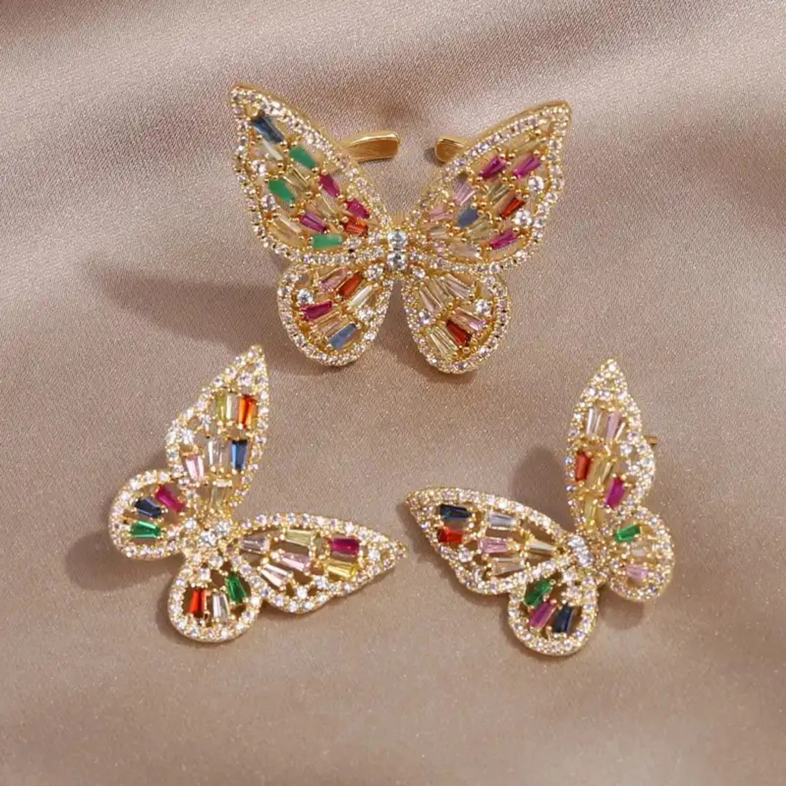 I trion ingår ett par örhängen och en stor fjärilsring, båda guldpläterade 14 karat 🦋🦋(Finns att köpa i guld/silver, men även separat om man endast vill ha ring eller örhängen, se då andra annonsen)