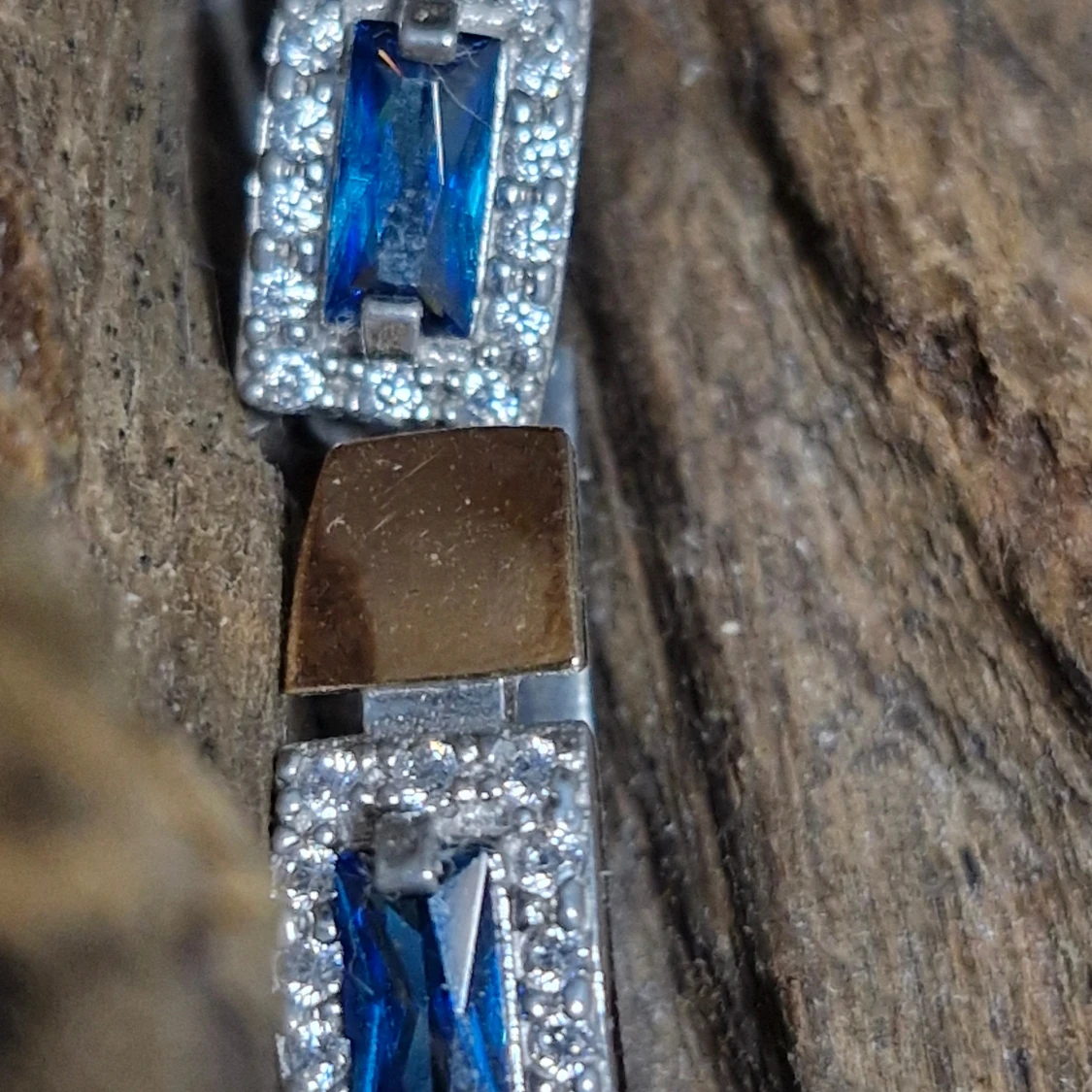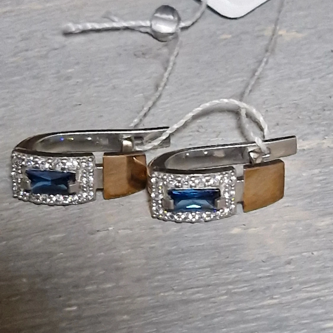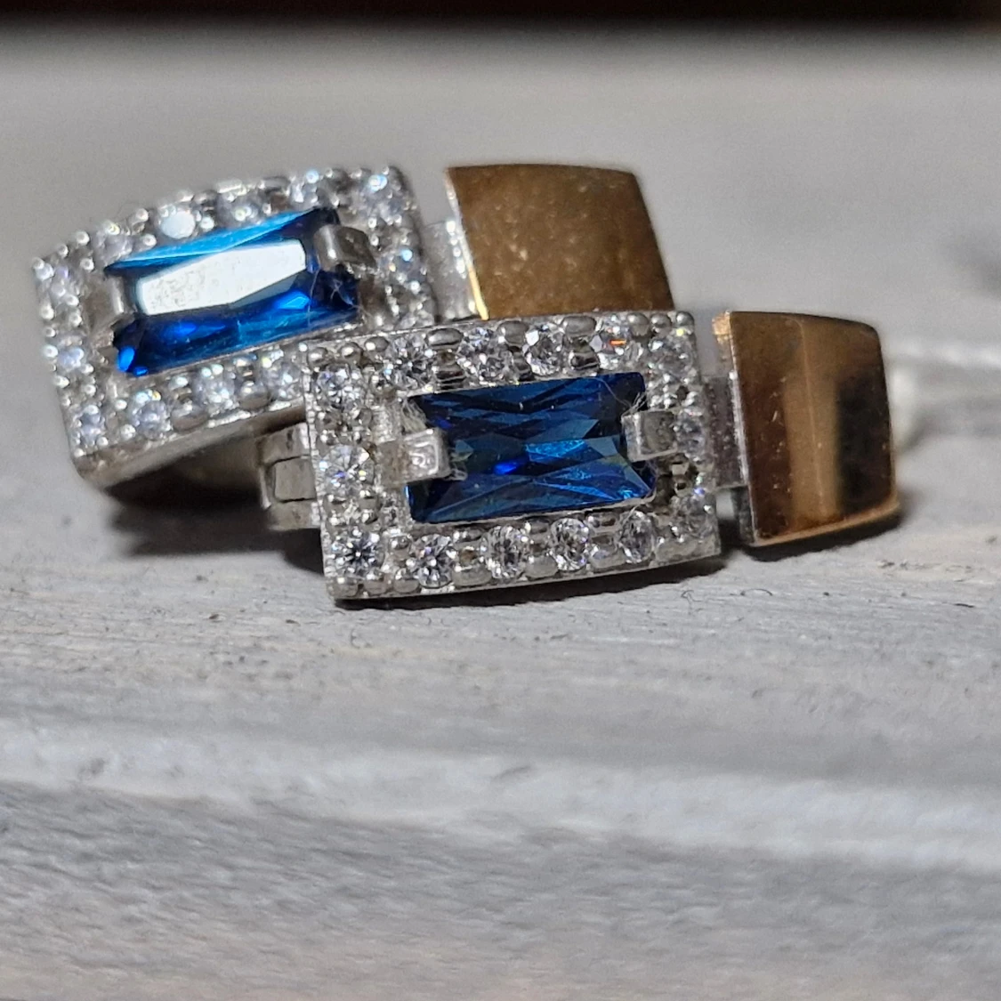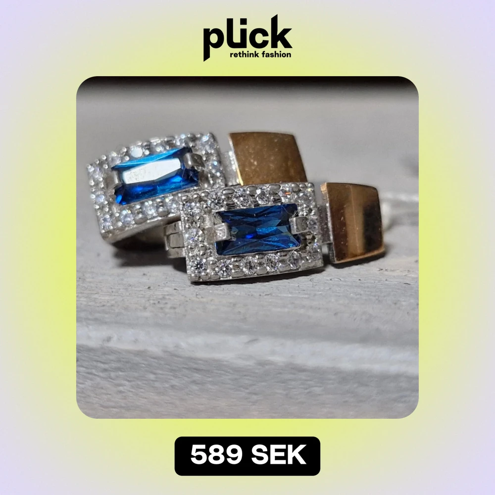 Snygga silverörhängen med en rektangulär blå sten i mitten, omgiven av glittrande små stenar. De har en unik design med en guldpläterad detalj på sidan. Perfekta för att ge en touch av elegans till vilken outfit som helst! Guld: 0.12 gram, 375 Silver: 3.60 gram, 925