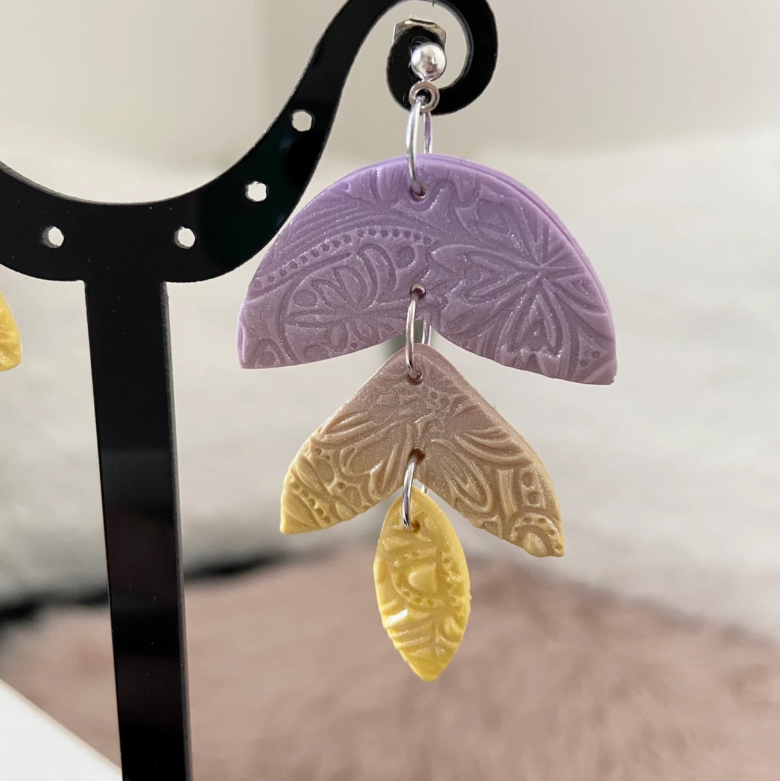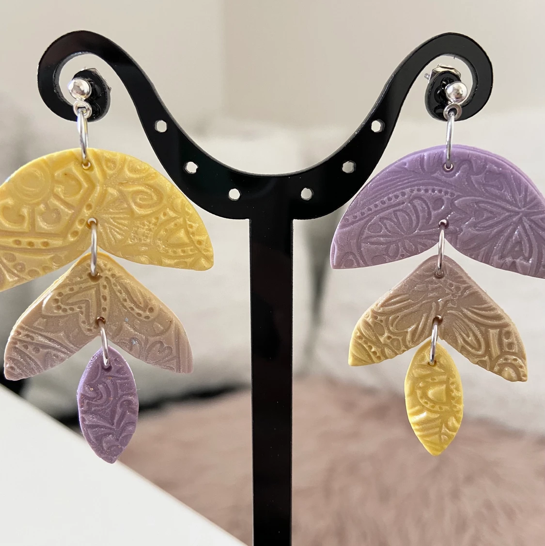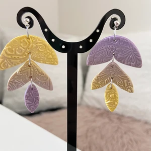 Handgjorda örhängen av lera. Samfraktar. Kontakta för flera bilder eventuellt video. Storlek ca 6 cm Står ej för postens slarv Kontakta för nickelfri alternativ