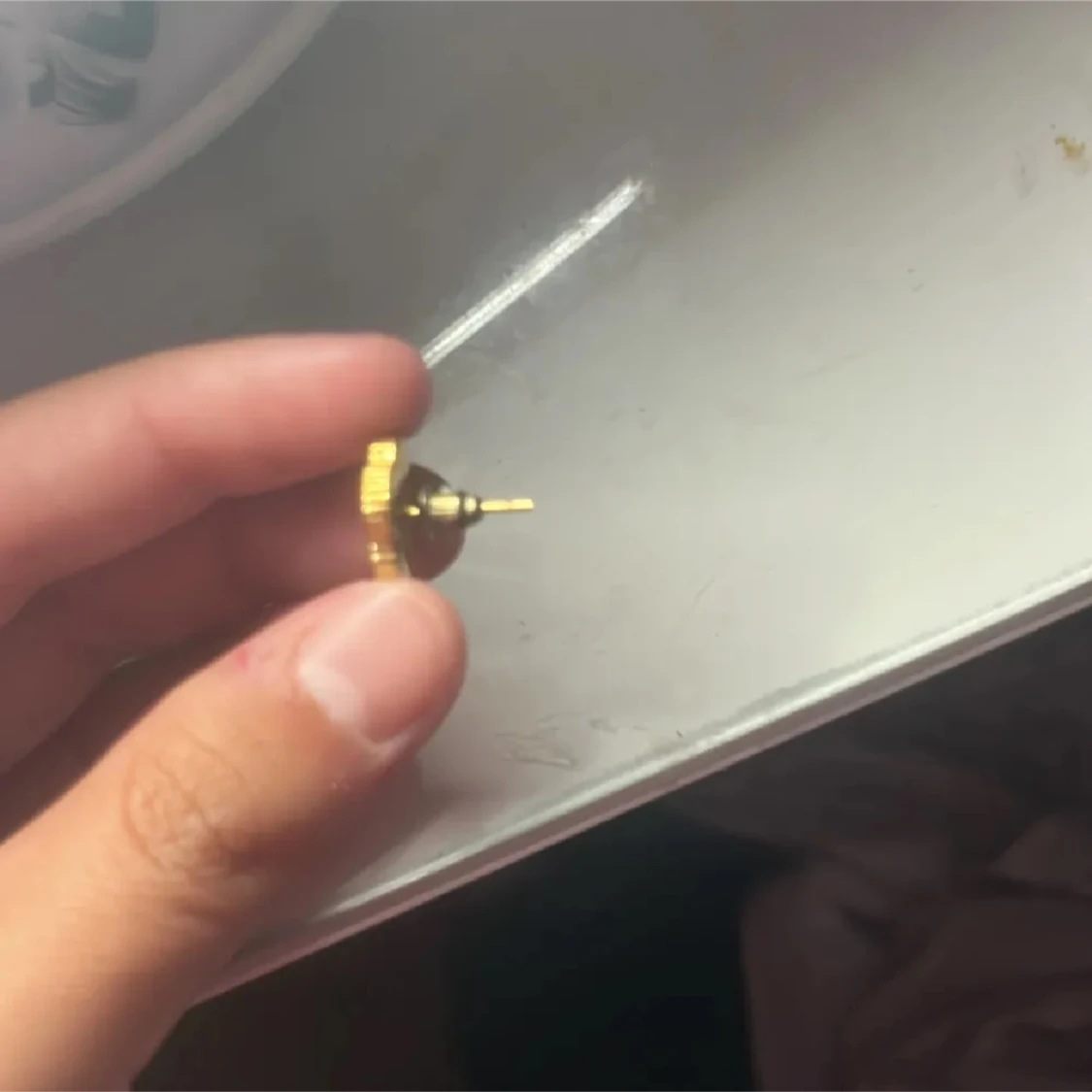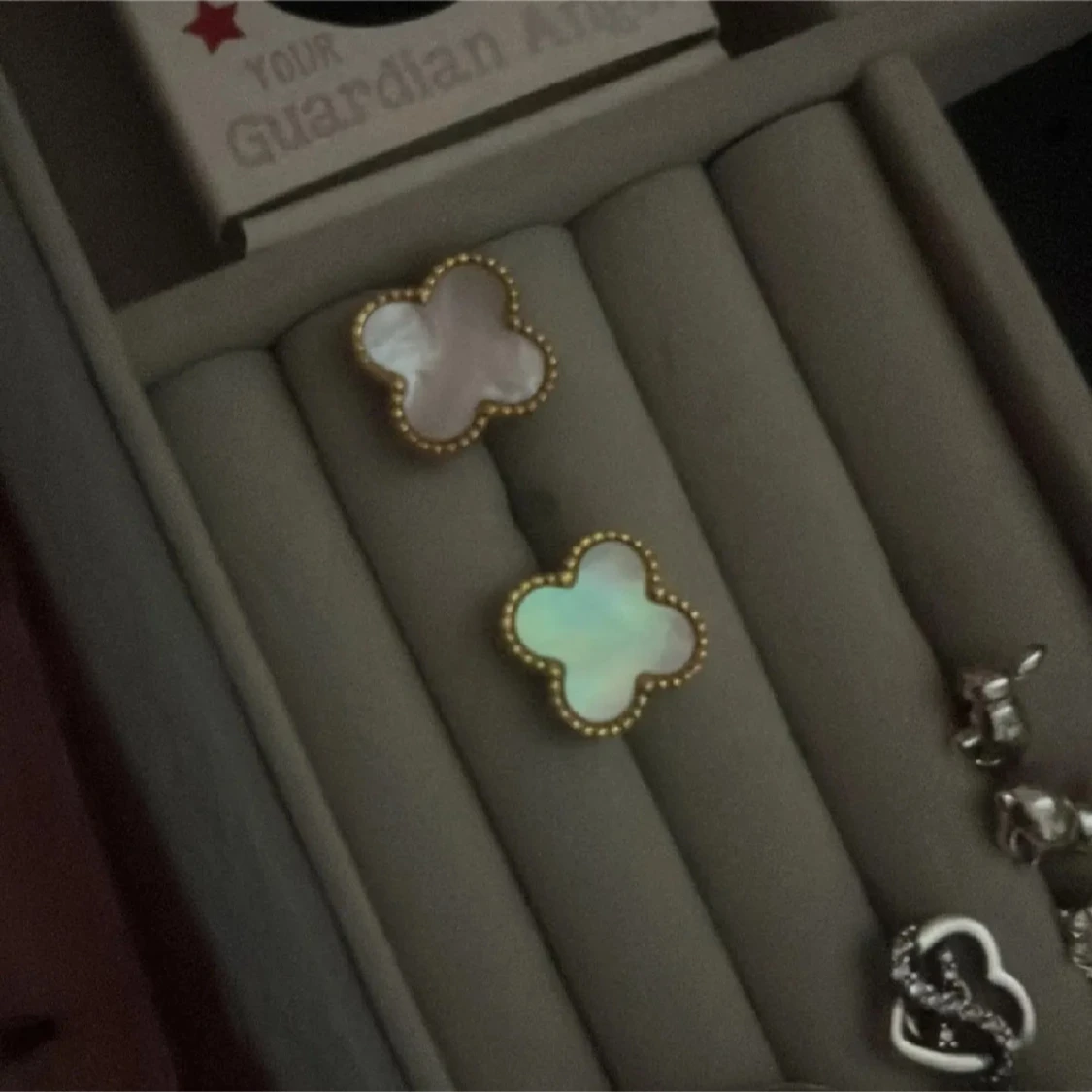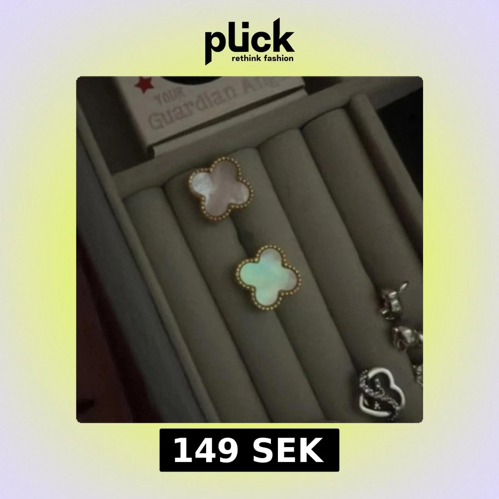 Säljer ett par snygga örhängen i form av fyrklöver med pärlemorskimrande insida och guldpläterad kant. Perfekta för dig som vill ha något unikt och stilrent i smyckeskrinet. Stiftmodell som sitter bekvämt på örat. Helt oanväbd då mina hål täppts till. Nypris 299kr. LÅDA TILLKOMMER