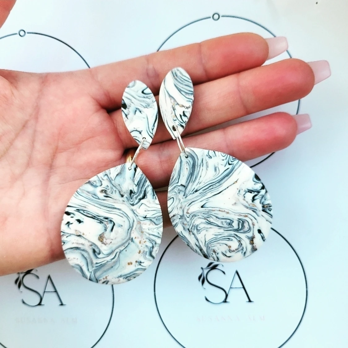HANDGJORDA ÖRHÄNGEN . Polymerleraed vackert marmorerat mönster med guldstänk