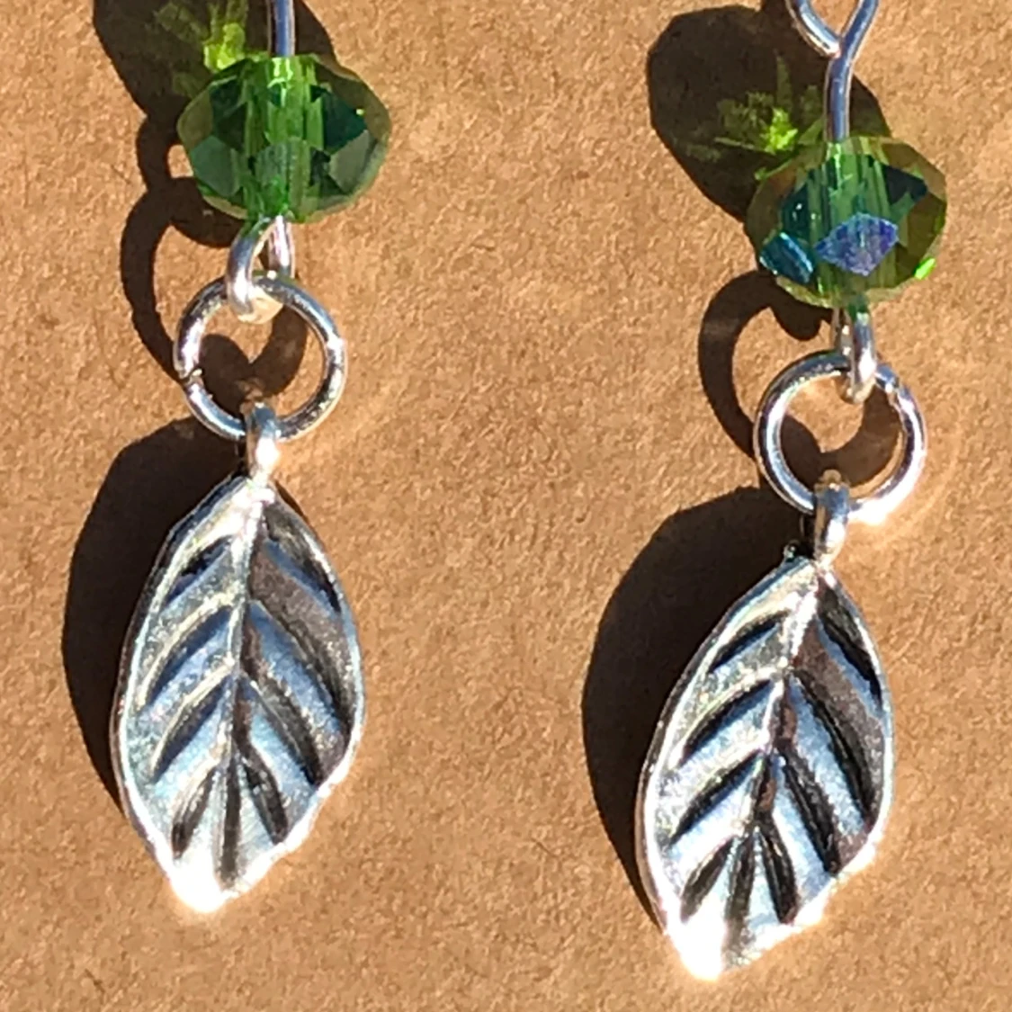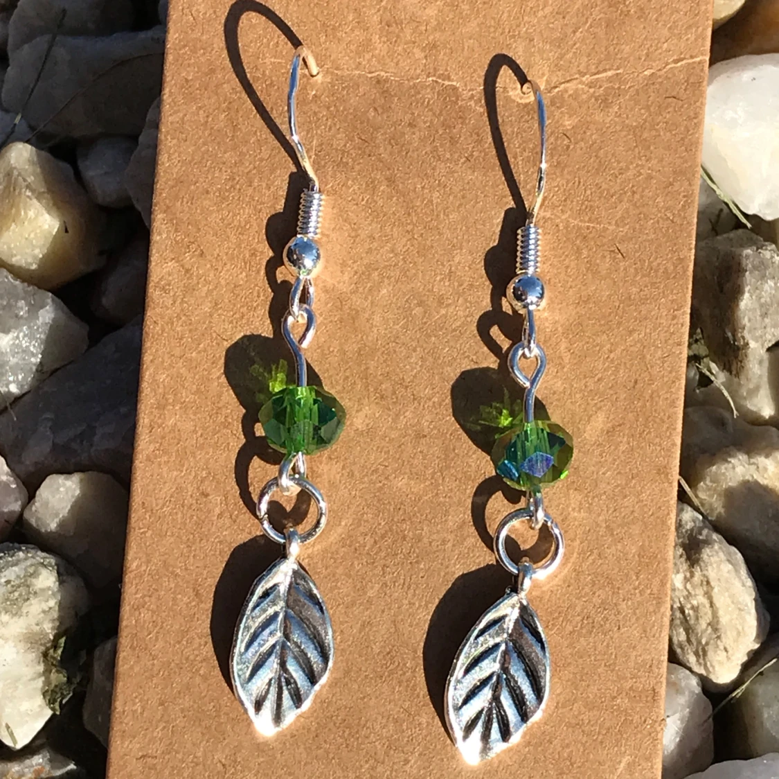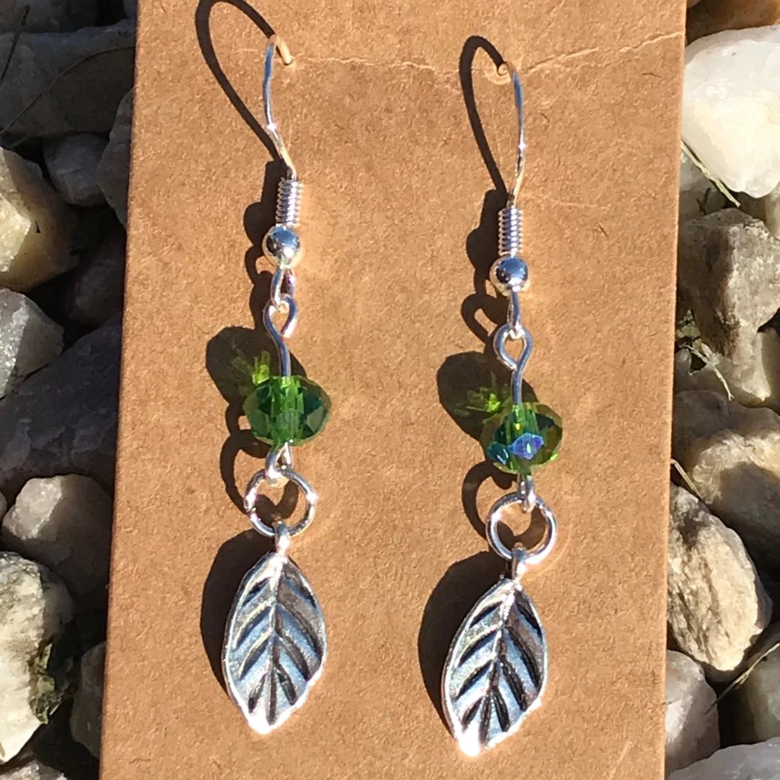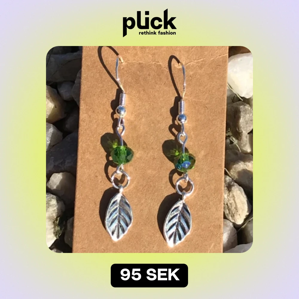 Vackra örhängen av gröna glaspärlor och silverlöv🍃