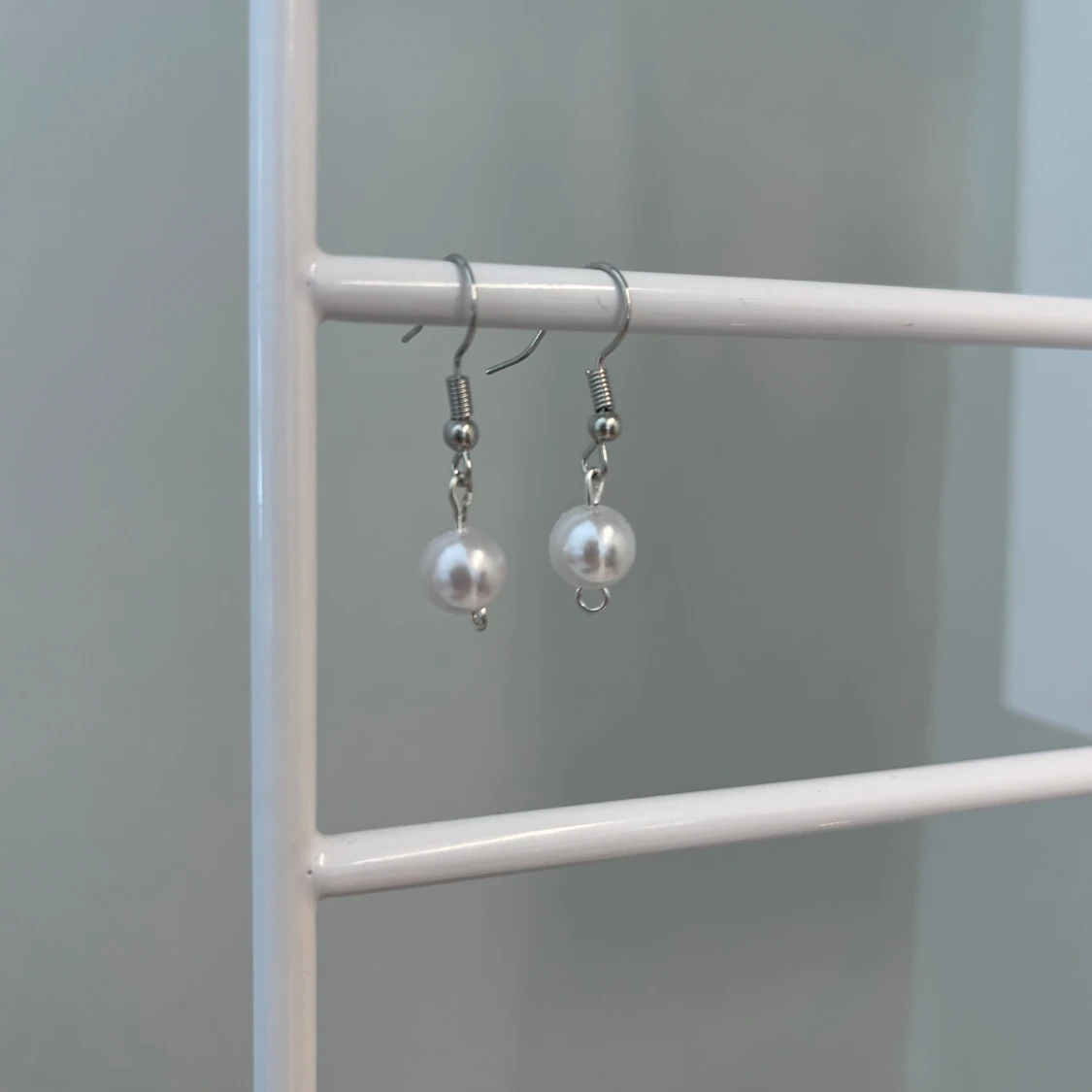 Stilrena örhängen med silverfärgade krokar och vita pärlor som hänger ned. Perfekta för att ge en klassisk touch till din look. Enkla att matcha och lätta att bära.