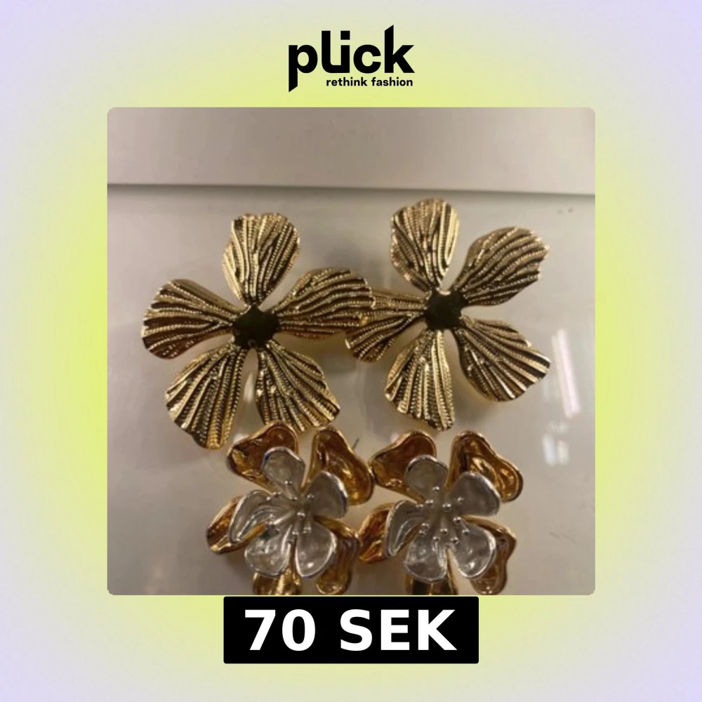 Säljer två par stora statement-örhängen i form av blommor. Ena paret är helt i guld med räfflade blad, det andra har guldiga blad med silvriga detaljer i mitten. Perfekta för dig som vill sticka ut med en cool och trendig accessoar.