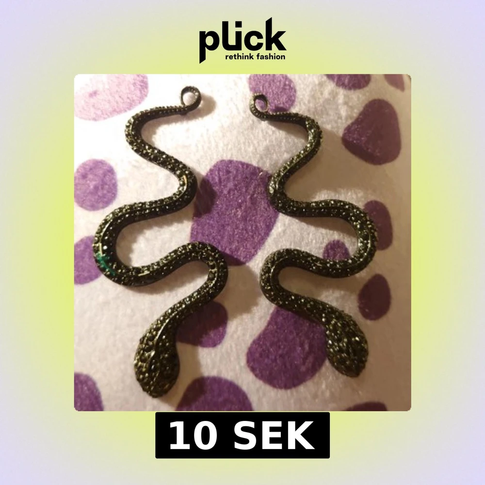 Unika svarta örhängen formade som ormar, dekorerade med glittrande stenar. Perfekta för att ge en edgy touch till din stil. De slingrande formerna ger en dramatisk effekt. Det är en dutt av grön färg på en av dem.