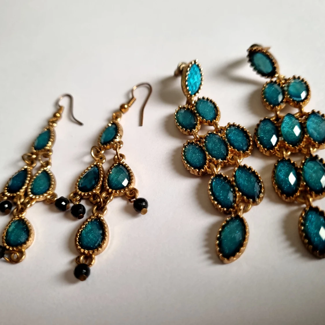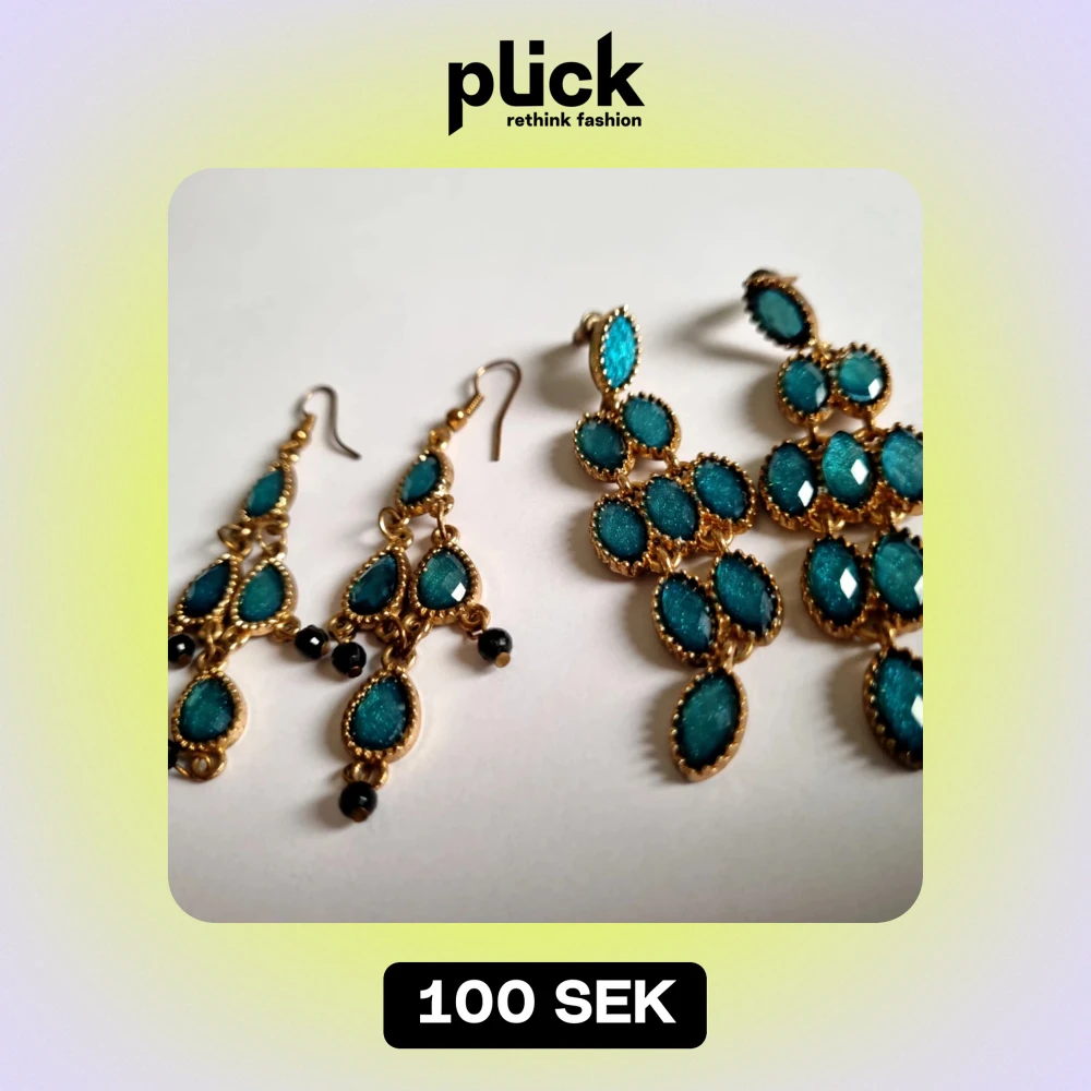 Snygga örhängen i guld med turkosa stenar. De har en elegant droppformad design och är perfekta för att ge en färgklick till din outfit. Passar både till vardag och fest. De små svarta pärlorna längst ner ger en extra touch av stil.