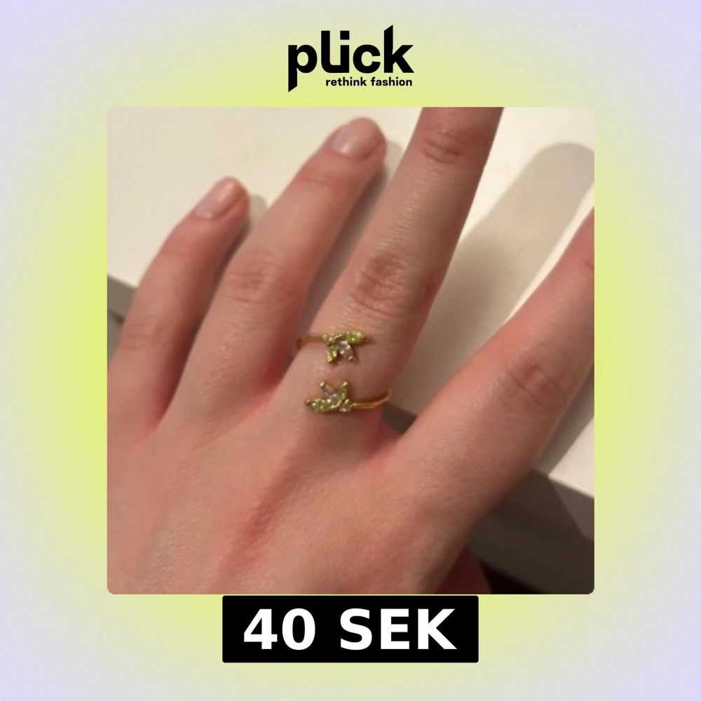 Elegant guldfärgad ring med två öppna ändar dekorerade med små gröna stenar. Justerbar storlek.