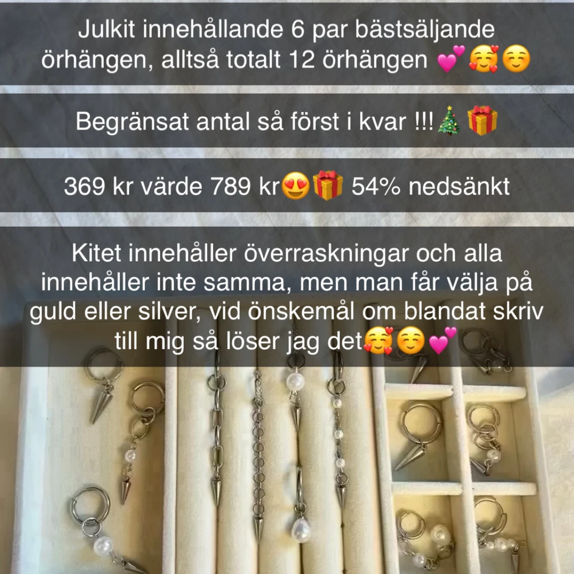 Julkit innehĂ„llande 6 par bĂ€stsĂ€ljande örhĂ€ngen, alltsĂ„ totalt 12 örhĂ€ngen đđ„°âșïž BegrĂ€nsat antal sĂ„ först i kvar !!!đđ 369 kr vĂ€rde 789 krđđ 54% nedsĂ€nkt. Kitet innehĂ„ller överraskningar och alla innehĂ„ller inte samma, men man fĂ„r vĂ€lja pĂ„ guld eller silver, vid önskemĂ„l om blandat skriv till mig sĂ„ löser jag detđ„°âșïžđ Detta kit innehĂ„ller silverörhĂ€ngen