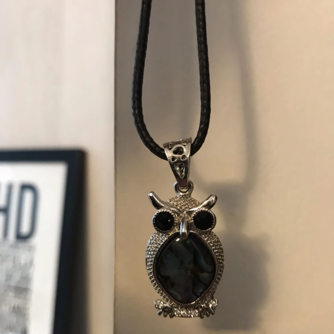 Supercoolt ugglehalsband med svart snöre, man kan reglera snöret lite. Frakt 10kr!