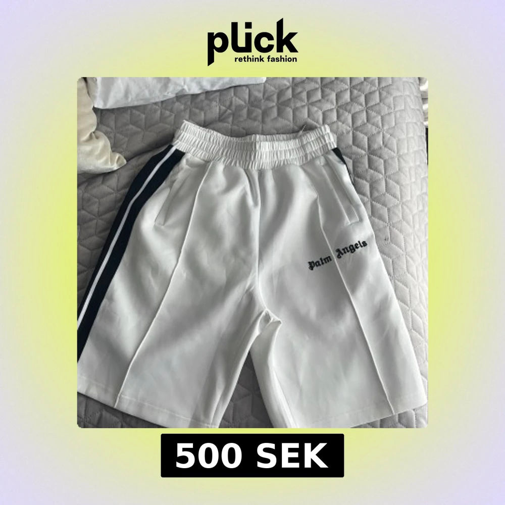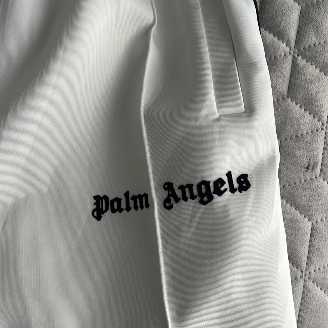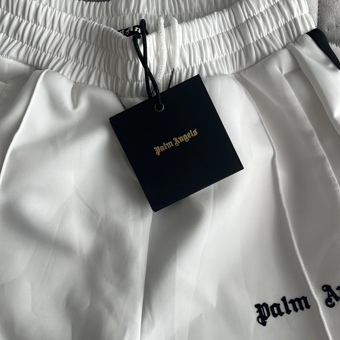 Palm Angels vita shorts med svarta sidoränder och broderad logga på vänster ben. De har elastisk midja med snörning och är tillverkade i ett slätt, sportigt polyestermaterial. Perfekta för en clean och sportig look.