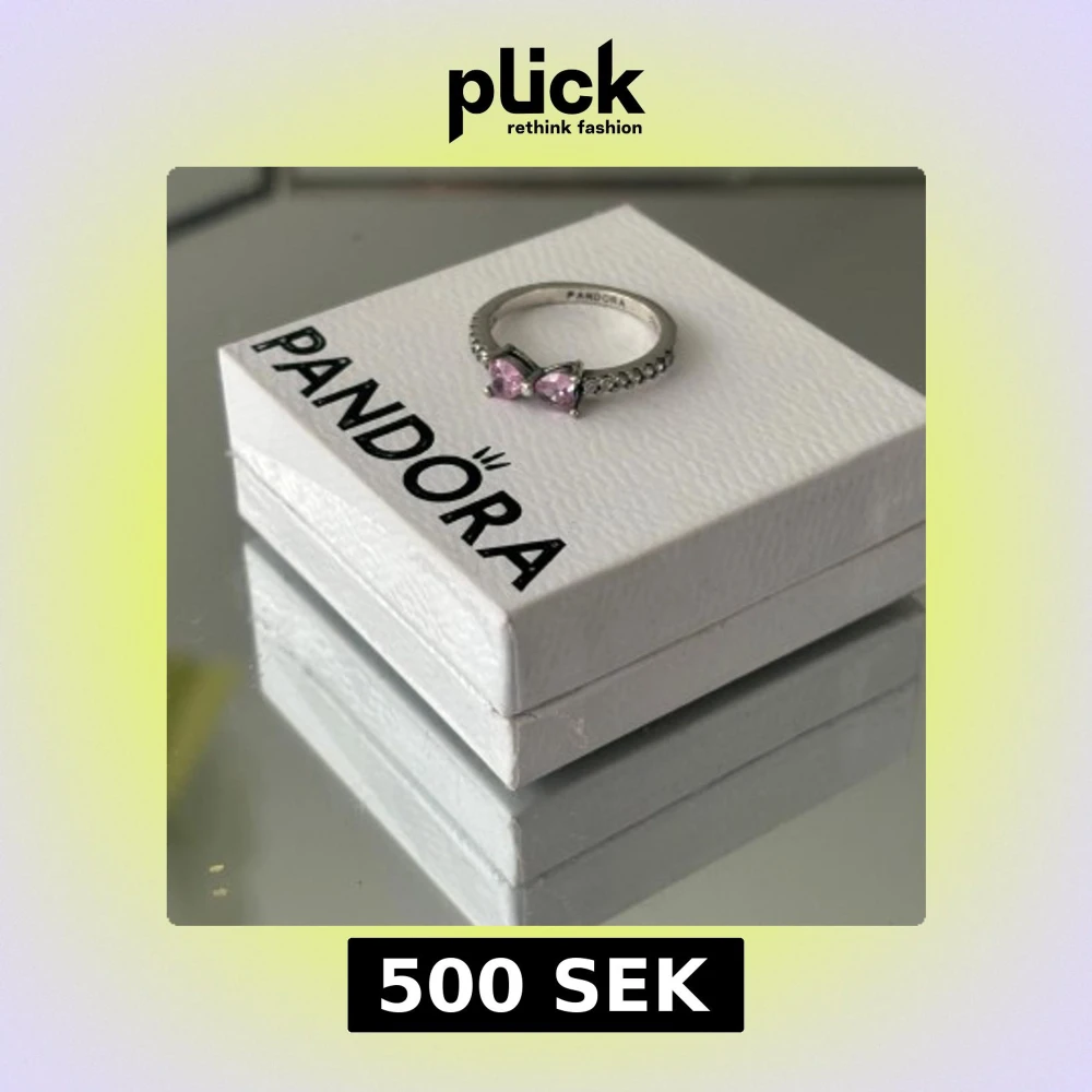 Säljer en söt silverring från Pandora med två hjärtformade rosa stenar framtill. Ringen har även små klara stenar längs bandet för extra glans. Perfekt för dig som gillar romantiska detaljer och vill ha något unikt.