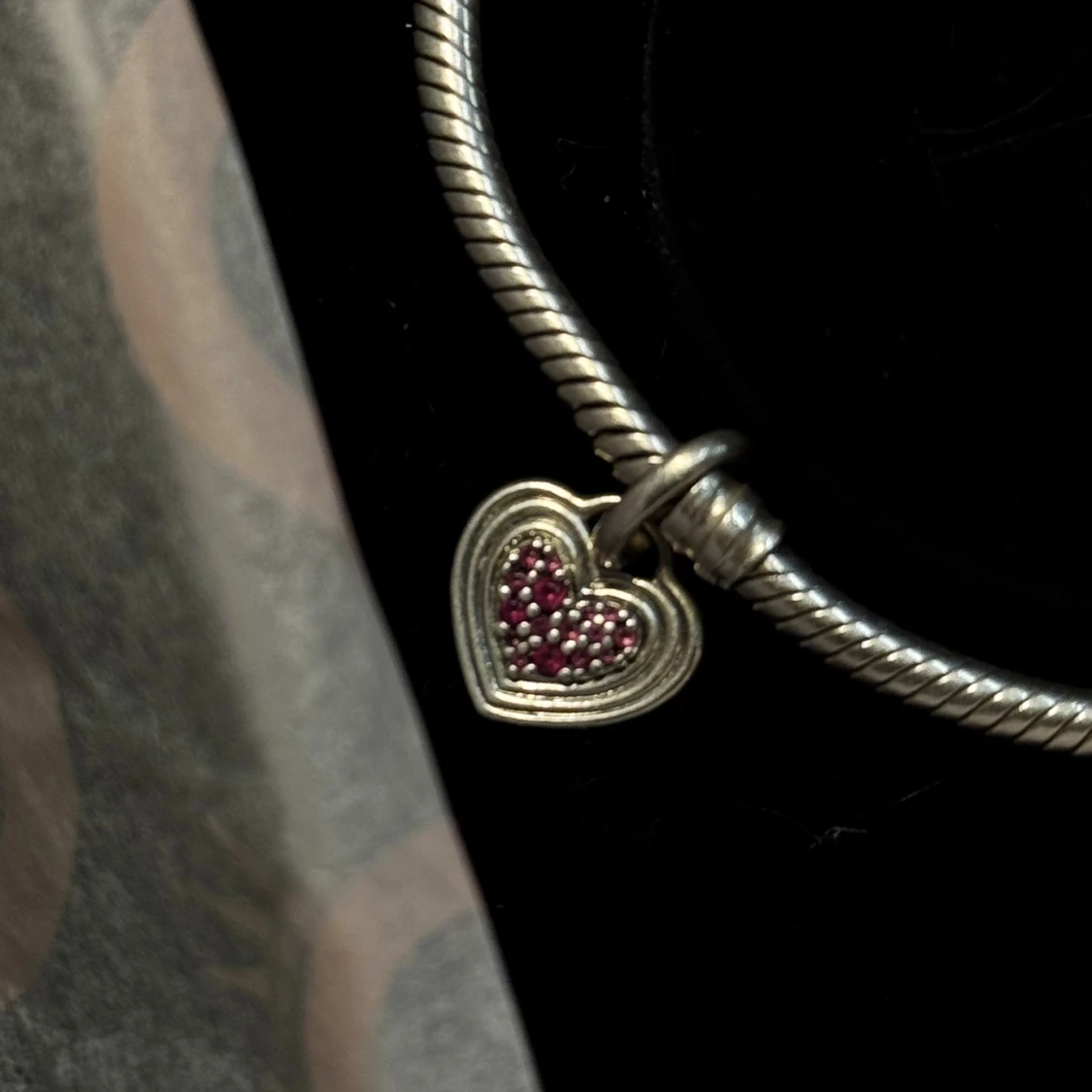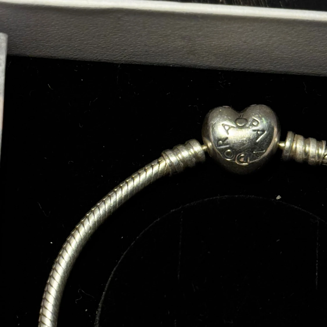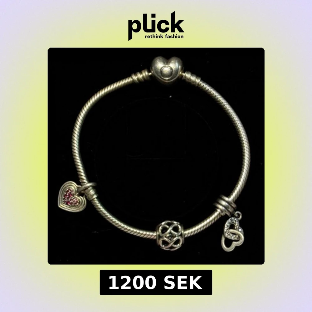 Snyggt silverfärgat armband från Pandora med tre berlocker. Låset är format som ett hjärta med Pandora-loggan. Mycket använt men i fint skick.