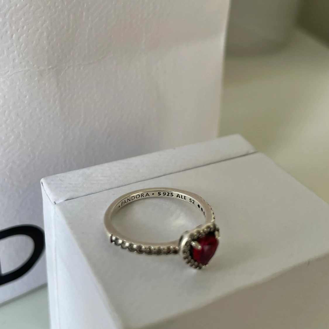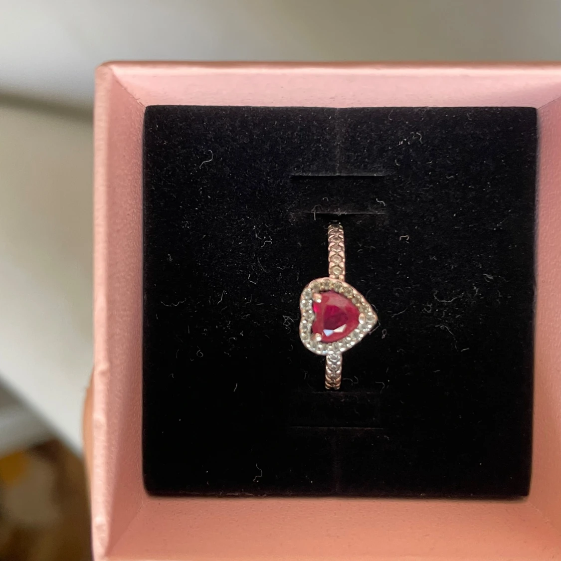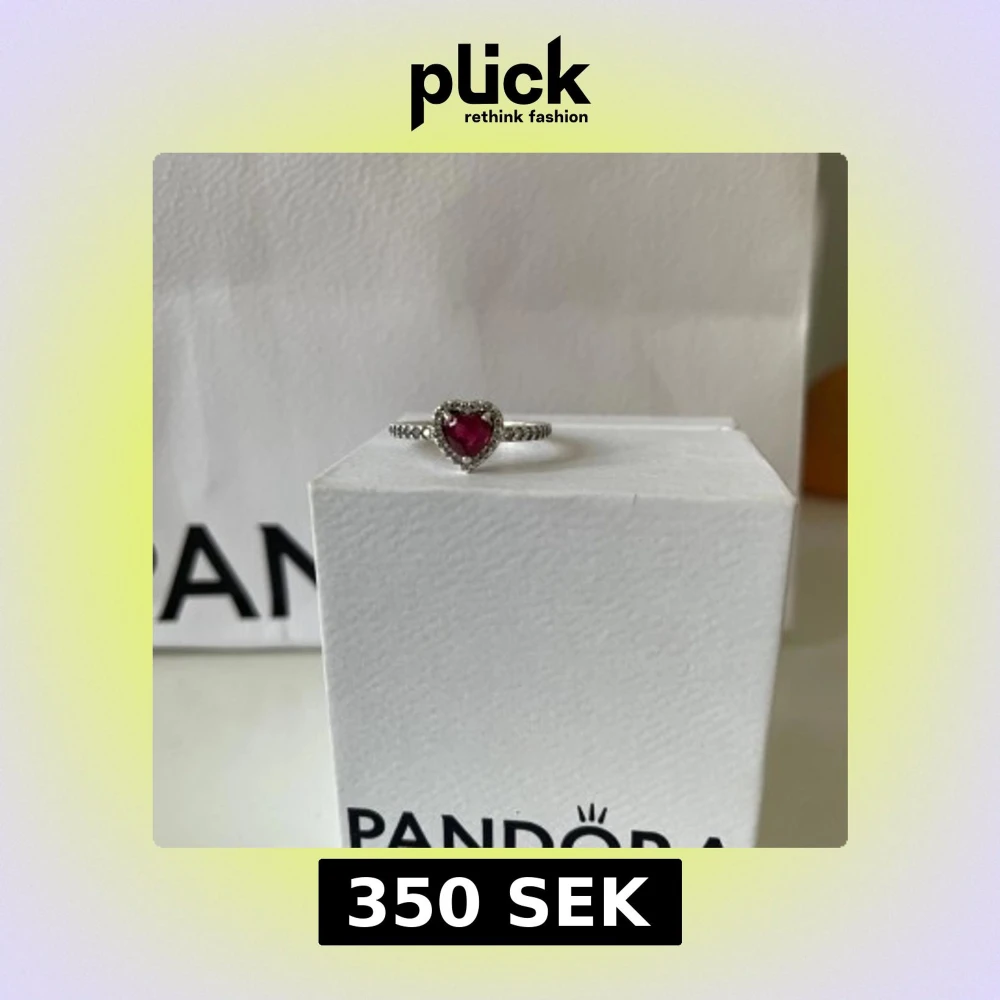 Superfin ring från Pandora i äkta silver med en gnistrande röd hjärtformad sten i mitten, omgiven av små klara stenar. Ringen har en detaljerad, pärlad ringband som ger extra lyxig känsla. Perfekt för dig som gillar romantiska smycken med lite bling.