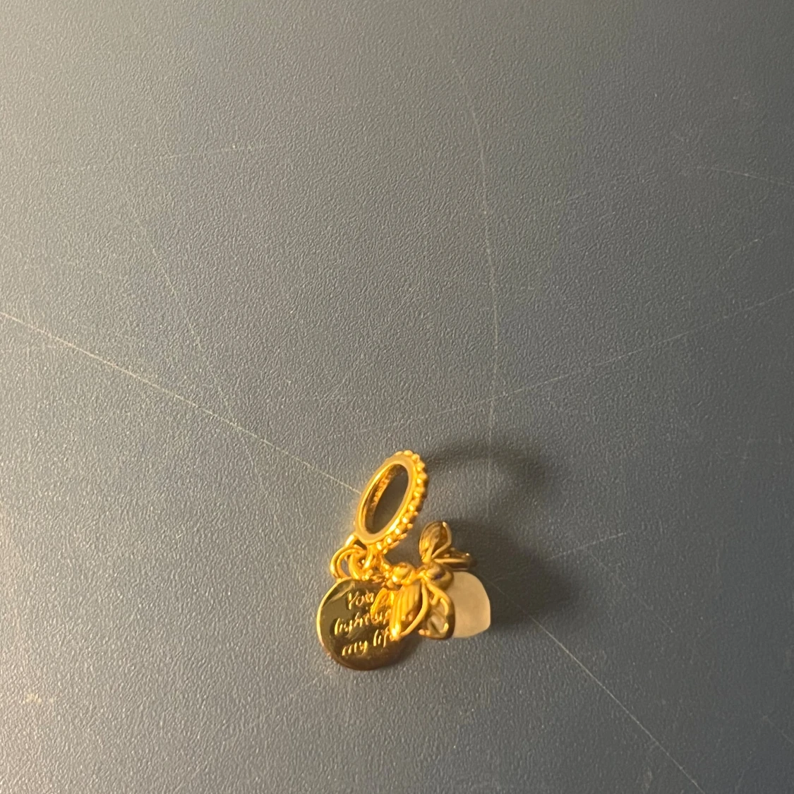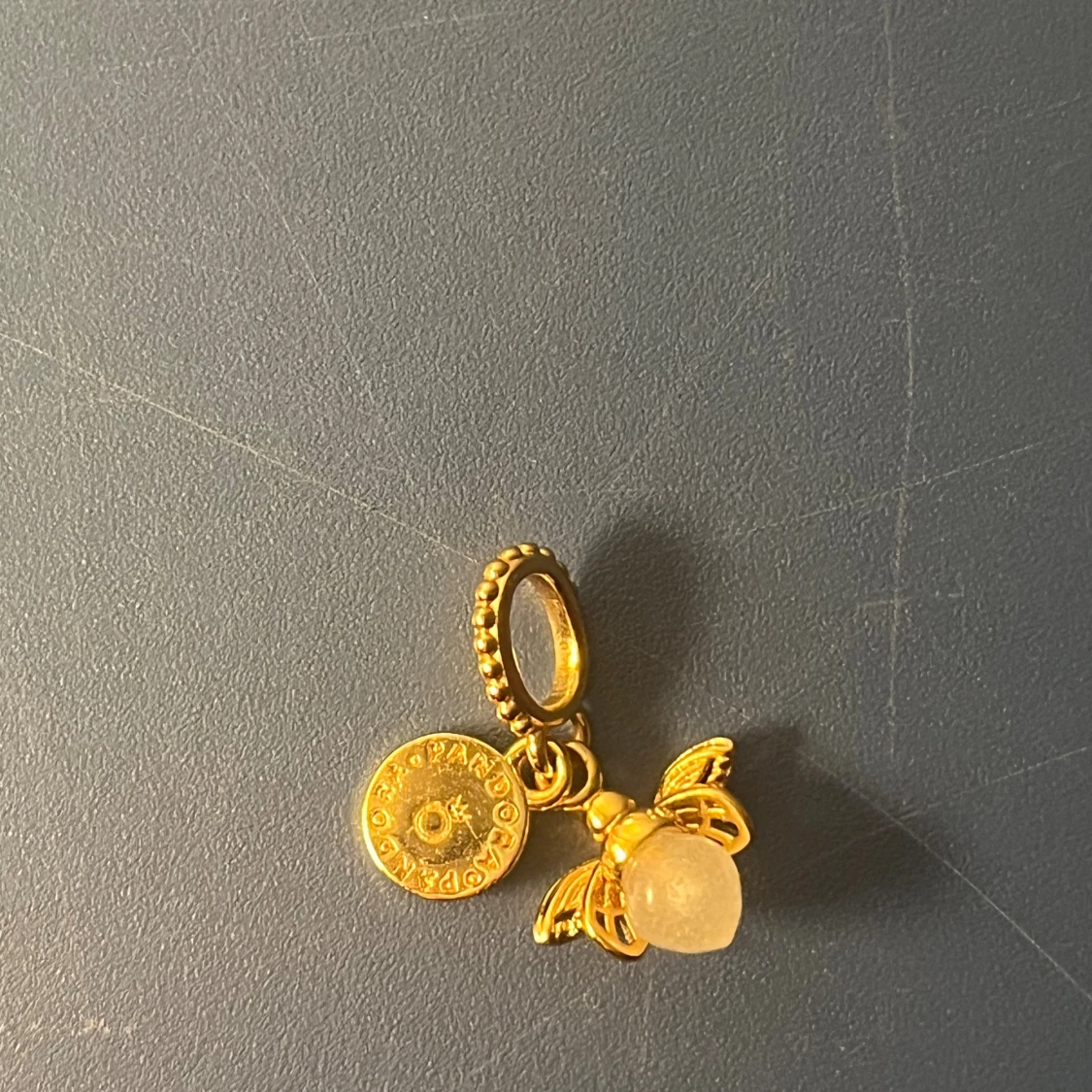 Säljer en snygg Pandora berlock i guldton med en söt firefly-design och rund platta med texten 'You light up my life'. Firefly’s kropp är i vit sten som lyser i mörker. Perfekt att hänga på armband för en personlig touch. Pris kan diskuteras