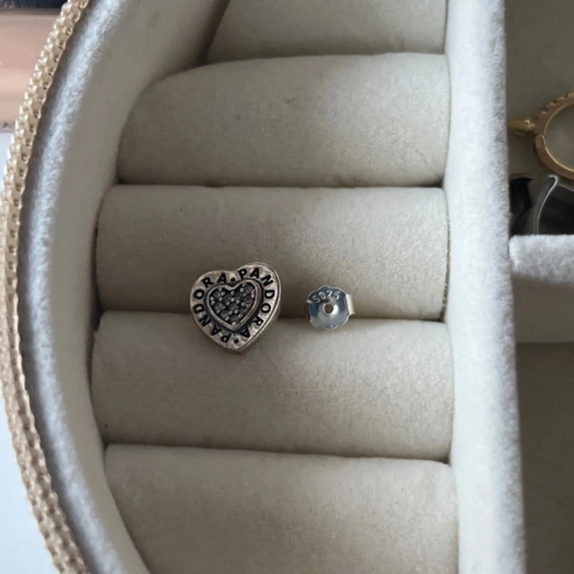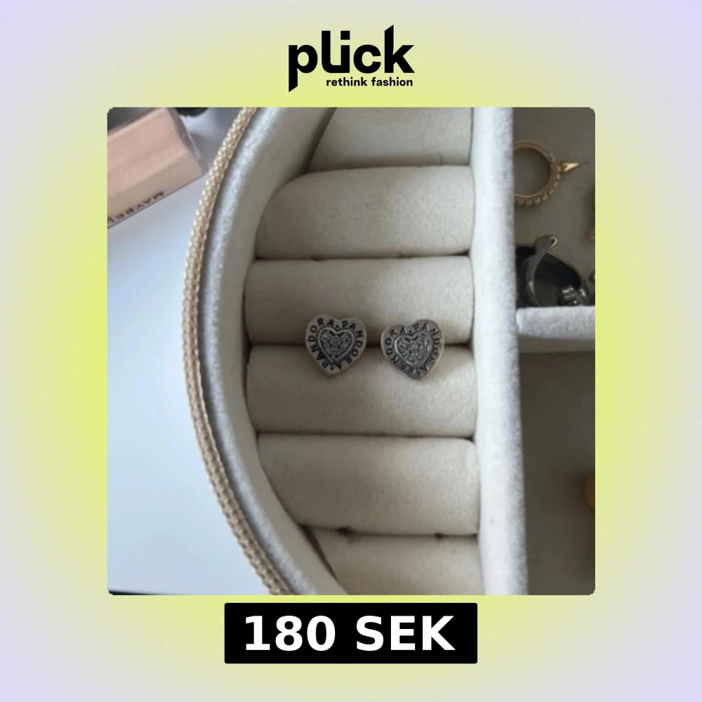 Säljer ett par snygga hjärtformade örhängen från Pandora i äkta silver. De har glittriga stenar i mitten och Pandora-loggan runt kanten. Perfekta för dig som gillar detaljer och vill ha något som sticker ut lite extra.