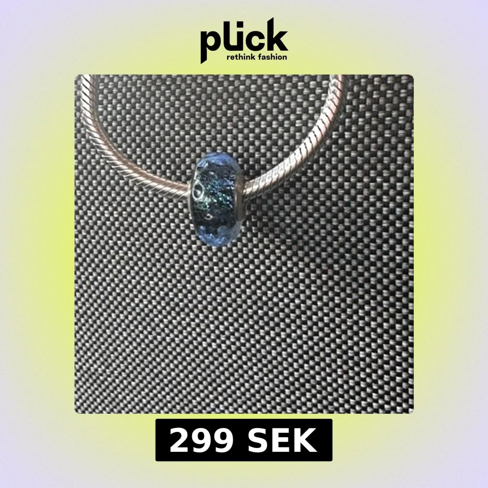 Säljer en snygg blå glittrig berlock från Pandora i glas med silverdetaljer. Perfekt att sätta på ditt armband för att ge det en unik touch. Berlocken har ett coolt mönster med skimrande effekt och är rund i formen.