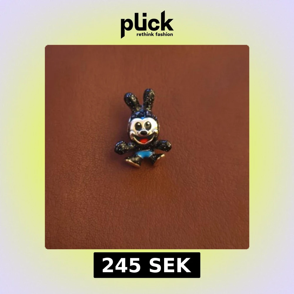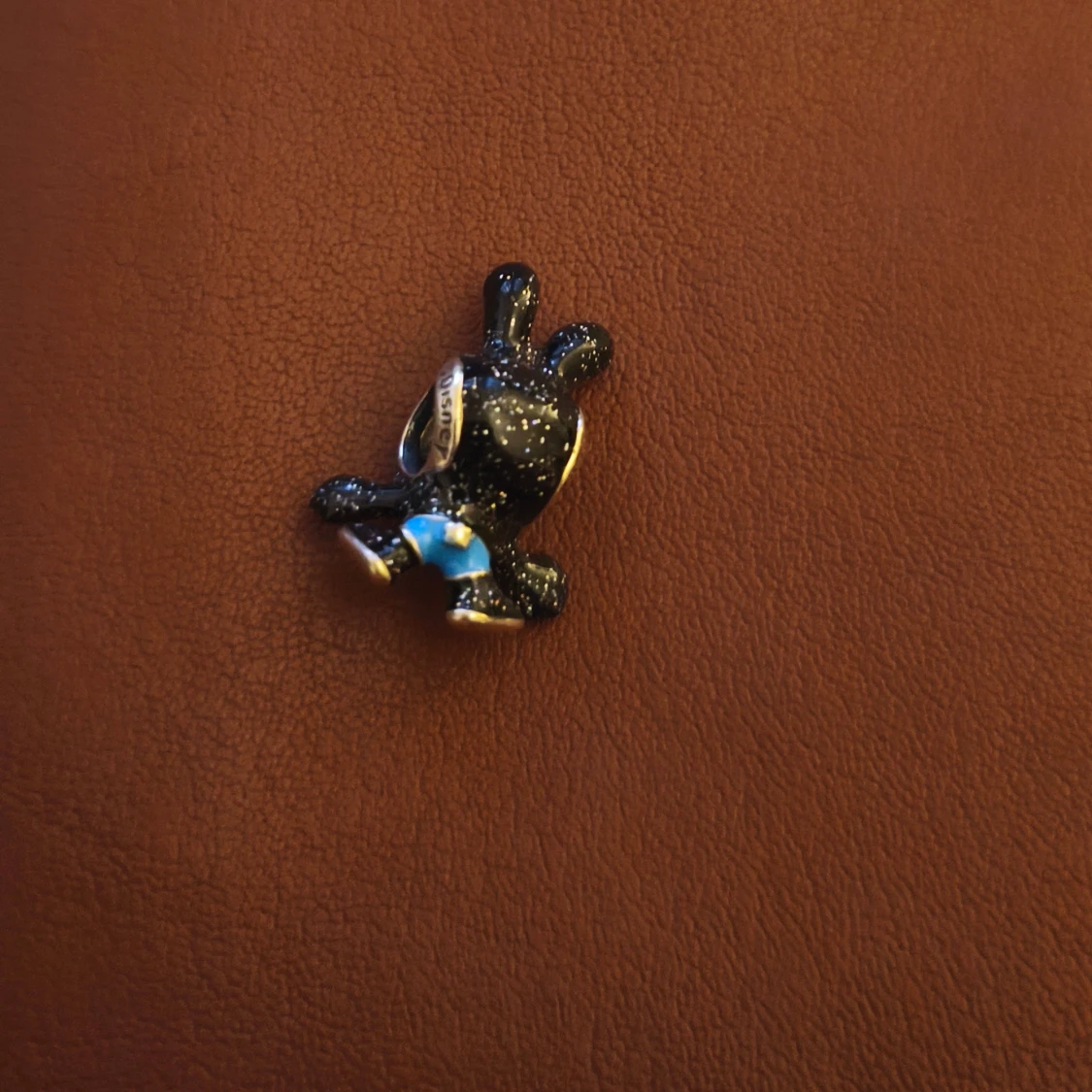 Supergullig berlock från Pandora i form av Oswald the Lucky Rabbit från Disney. Smycket är svart med vita prickar, blåa shorts och silvriga detaljer. Perfekt att hänga på ett armband eller halsband för en lekfull touch.