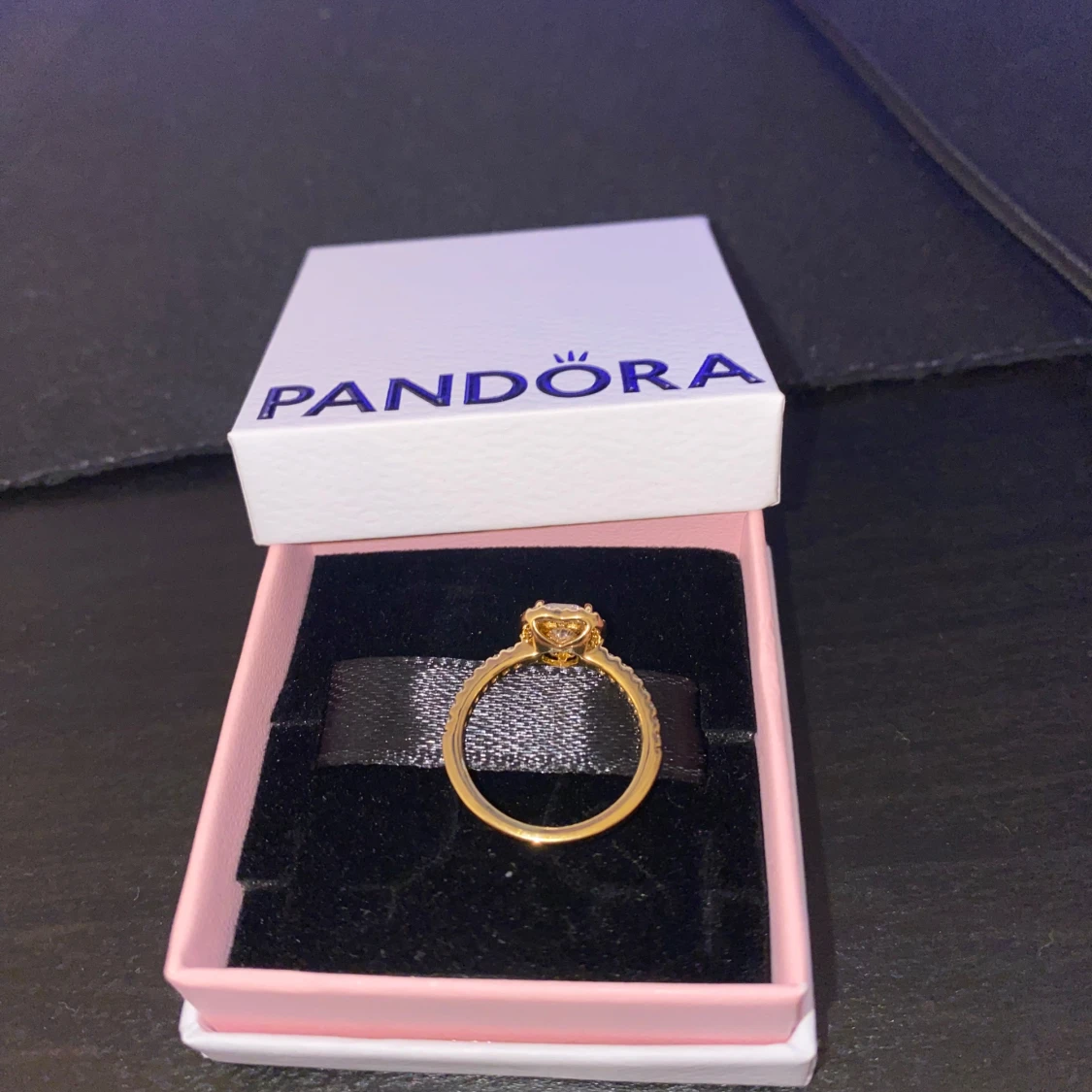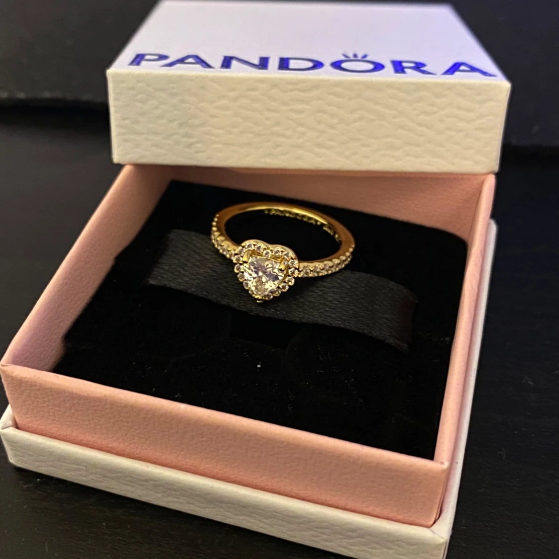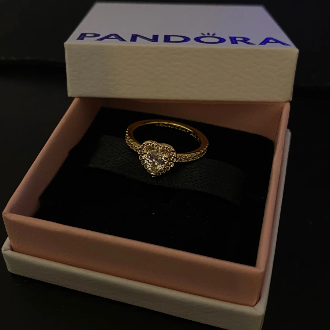 Elegant guldfärgad ring från Pandora med ett glittrande hjärta i mitten. Äkta 14k guldpläterat. Säljer denna ring eftersom jag råka köpa fel storlek till min tjej det är storlek 48 i diameter. Perfekt att ge sin tjej. Mitt Pris 800kr, original pris 1200kr