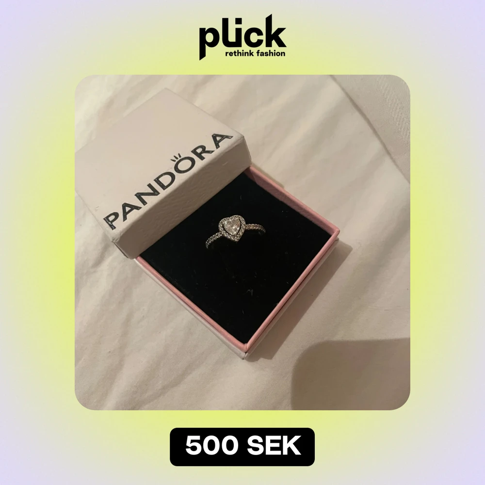 Säljer en elegant silverring från Pandora med en glittrig hjärtformad sten i mitten. Ringen har små stenar längs bandet som ger extra bling. Perfekt för speciella tillfällen eller som en fin present. Kommer i originalförpackning.
