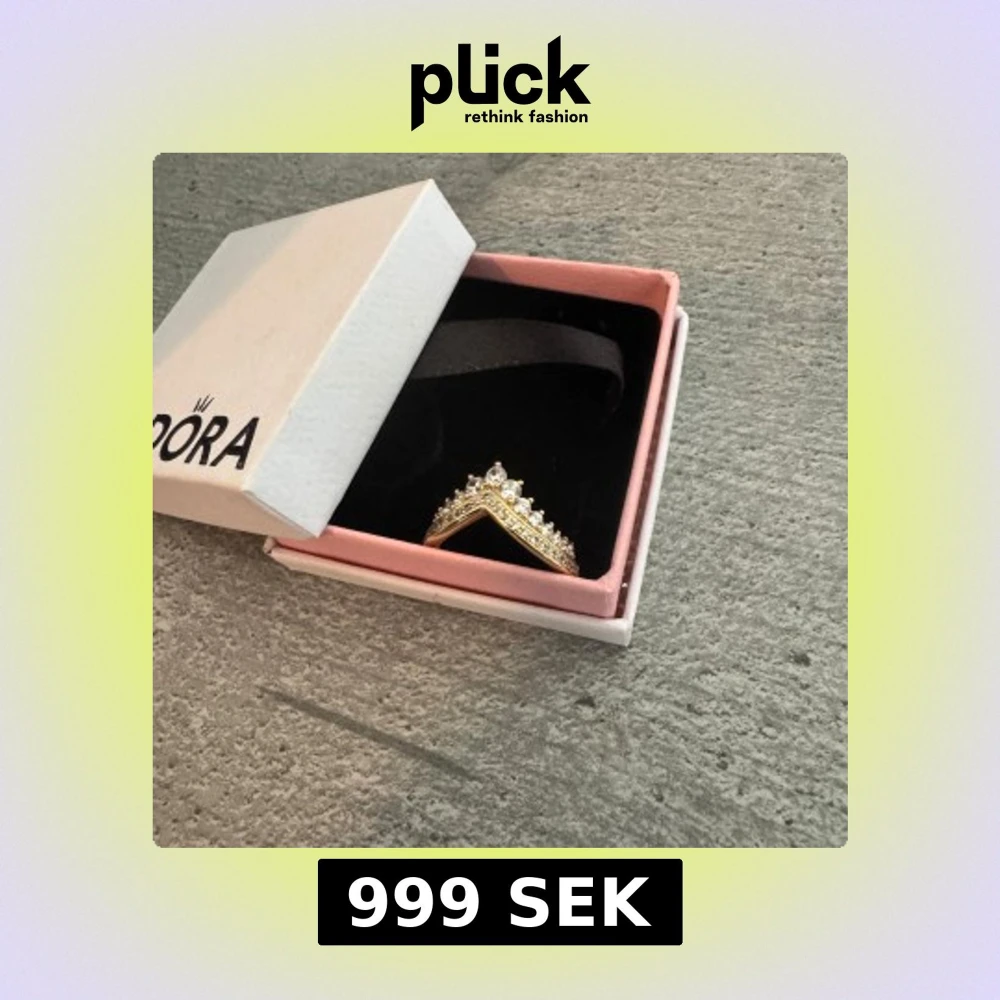 Snygg guldfärgad ring från Pandora med V-formad design och glittrande stenar längs hela ovansidan. Ringen har en elegant och modern look med flera små vita stenar som ger extra bling. Perfekt för dig som vill sticka ut med dina accessoarer. (Helt oanvänd och perfekt för dig som tycker om accessoarer)