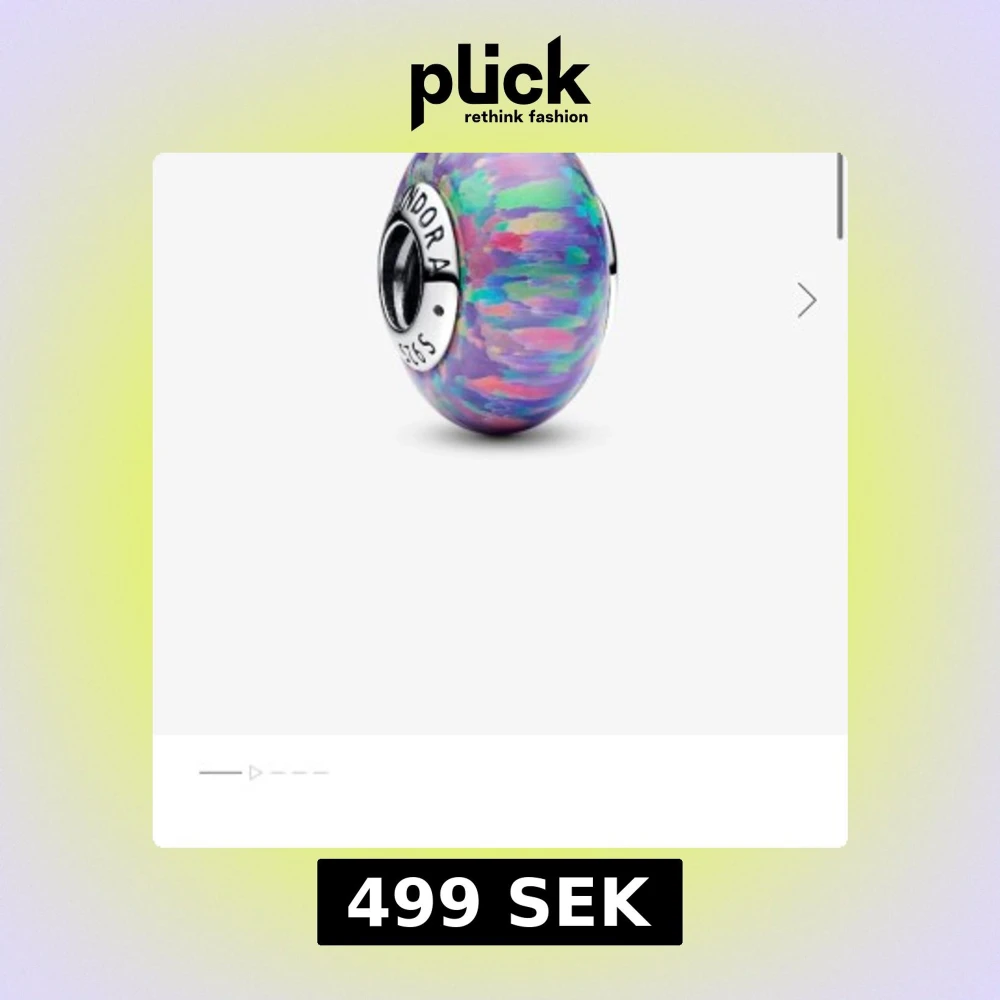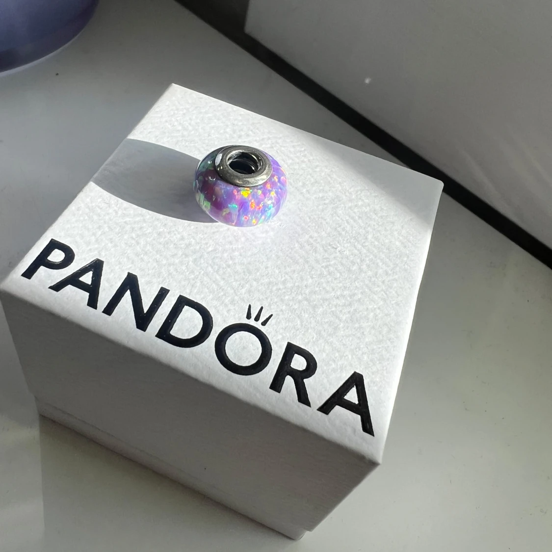 Superfin Pandora-berlock i lila med glittriga inslag av grönt, rosa och blått. Rund form med silverdetaljer och ett färgstarkt, shelf oanvänd och nytt skick, nypris 549💗🥰