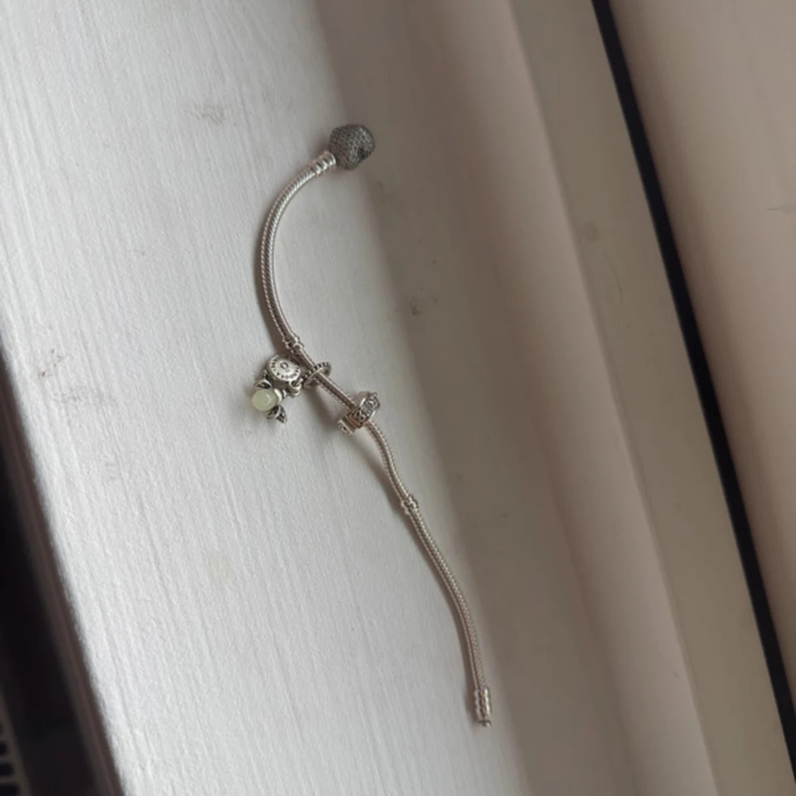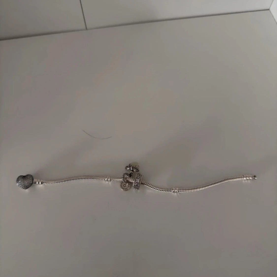 Snyggt silverfärgat armband från Pandora med en berlock.. Armbandet har klassisk ormkedja och detaljerade charms som ger en personlig touch. Perfekt accessoar för att lyfta din stil. Aldrig använt men har ej lådan kvar då jag fick de som en present