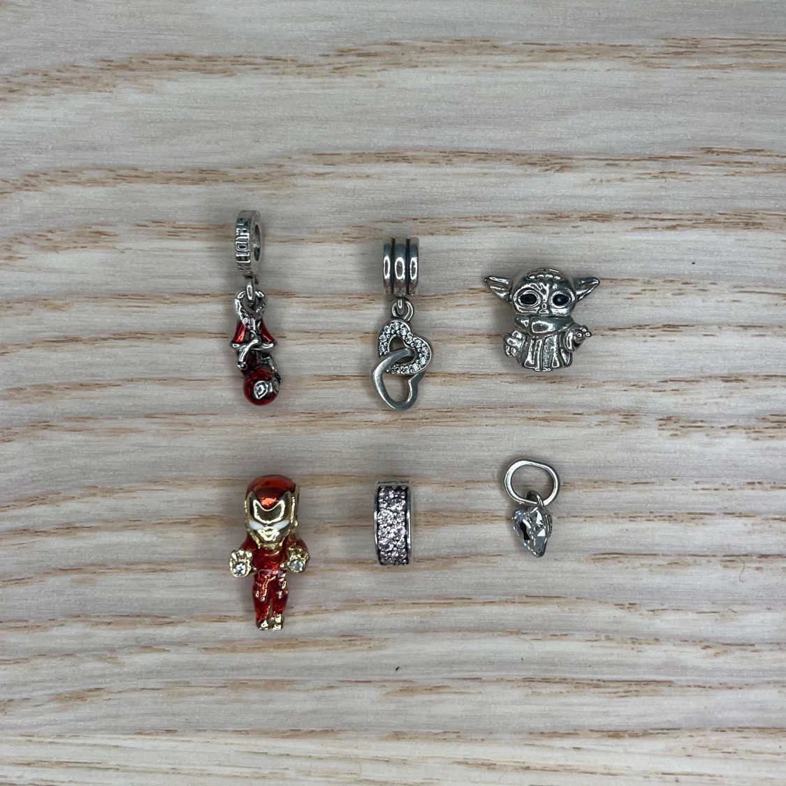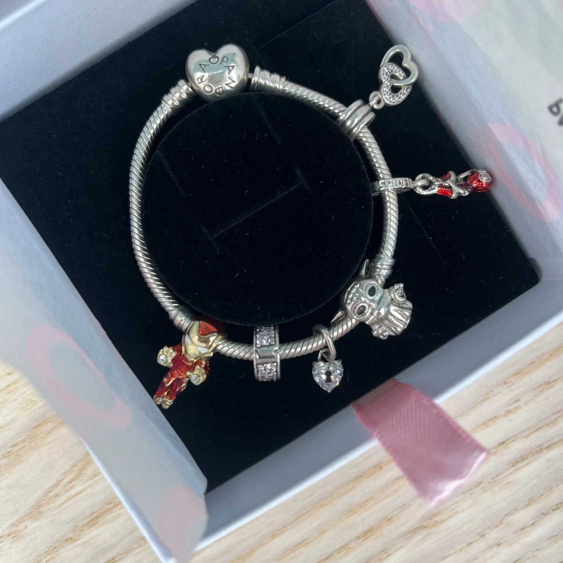 Säljer ett snyggt Pandora armband i silver med hjärtformat lås och sex unika berlocker. ⚠️ Det går ej att bara köpa armbandet, minst två berlocker!! Ironman-600kr. Babyyoda-400kr. Spiderman-600kr. Två hjärtan- 350kr. Ett hjärta- 250kr. Clip med rosa diamanter- 350kr