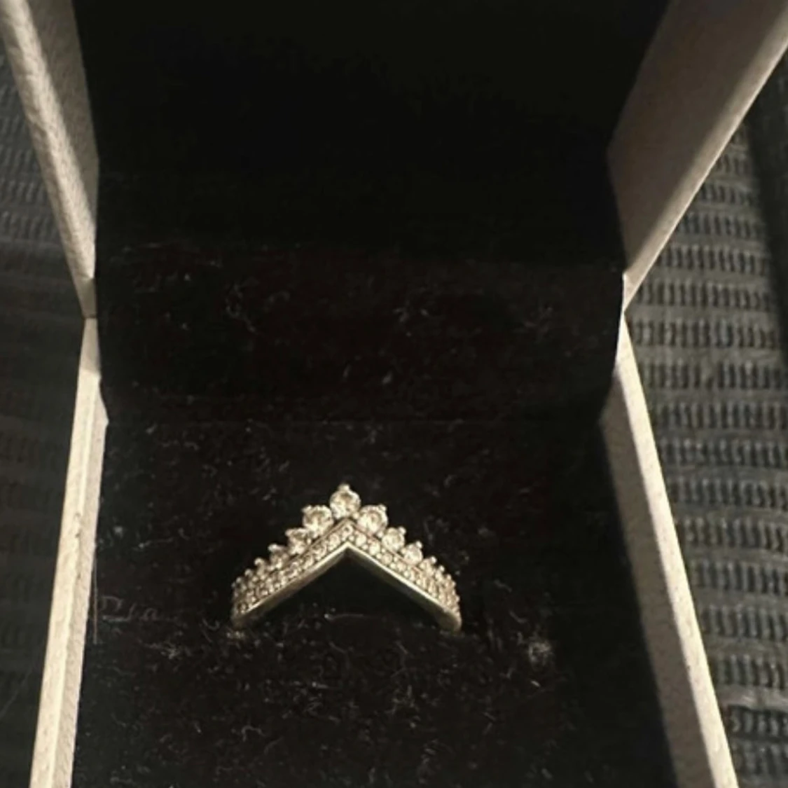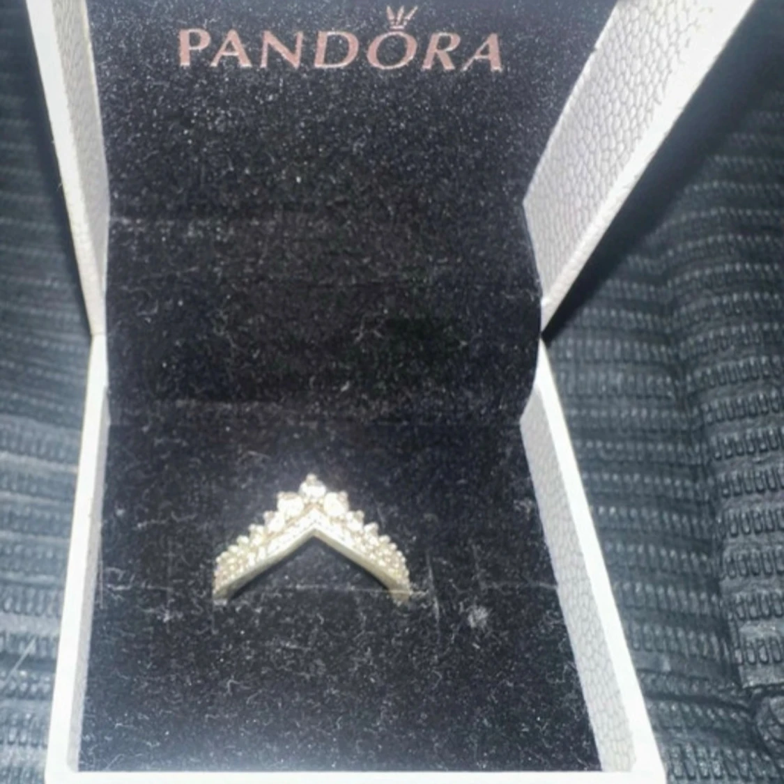 Superfin silverring från Pandora i en spetsig V-form, dekorerad med små glittrande stenar som ger en riktigt lyxig känsla. Perfekt för dig som vill ha något extra på fingret. Ringen är i äkta 925 silver och kommer i originalask. Stl 50.
